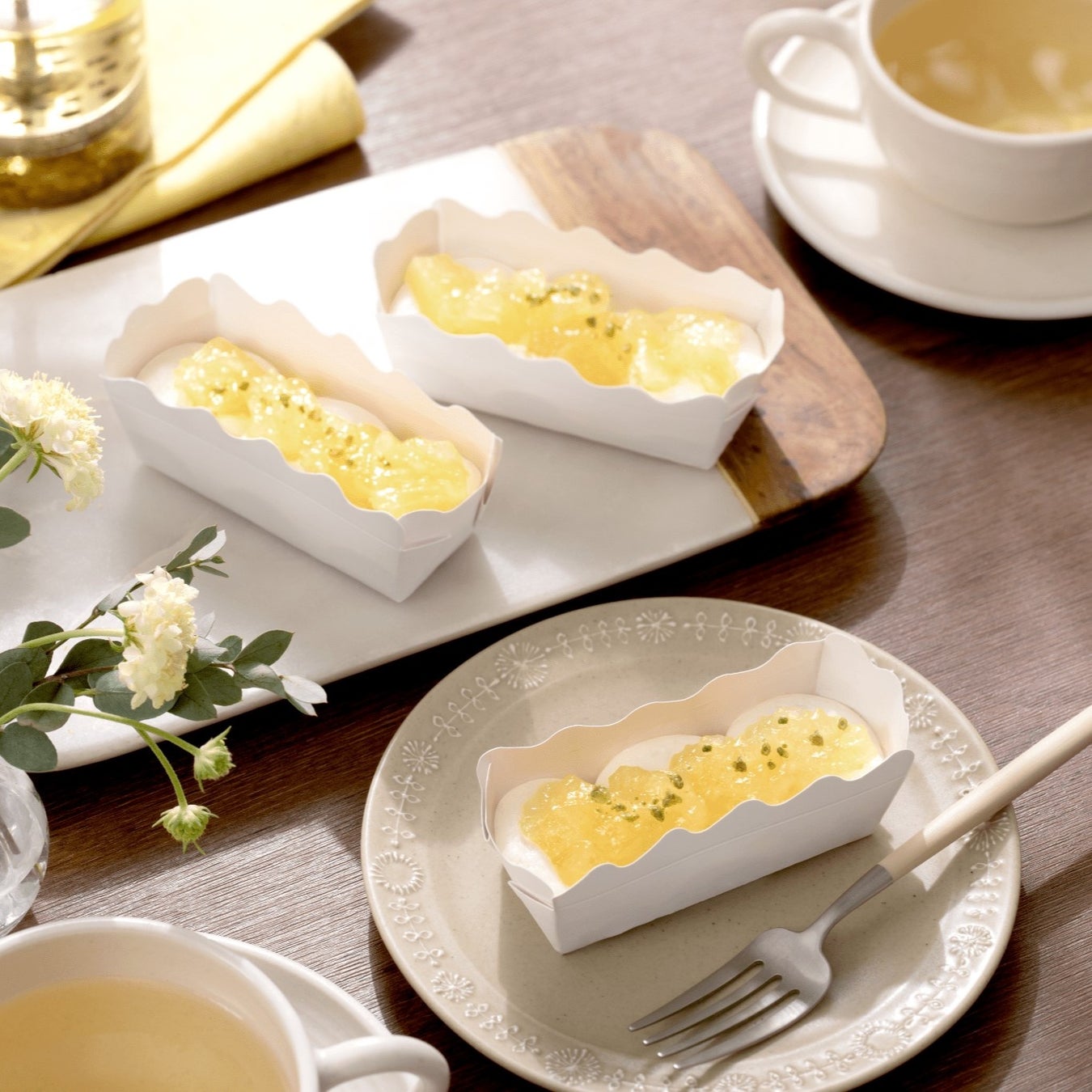 南国フルーツのパイナップルのジューシーさとコク深いバナナの風味が溶け合い、甘みが豊かで食べ応えのある一品に仕上げております。バナナムース、ごろっと果肉感が楽しめるパインソース、レモン風味の寒天ゼリーを重ねました。抹茶をまぶしたアーモンドをトッピングし、見た目にも鮮やかな一品です。