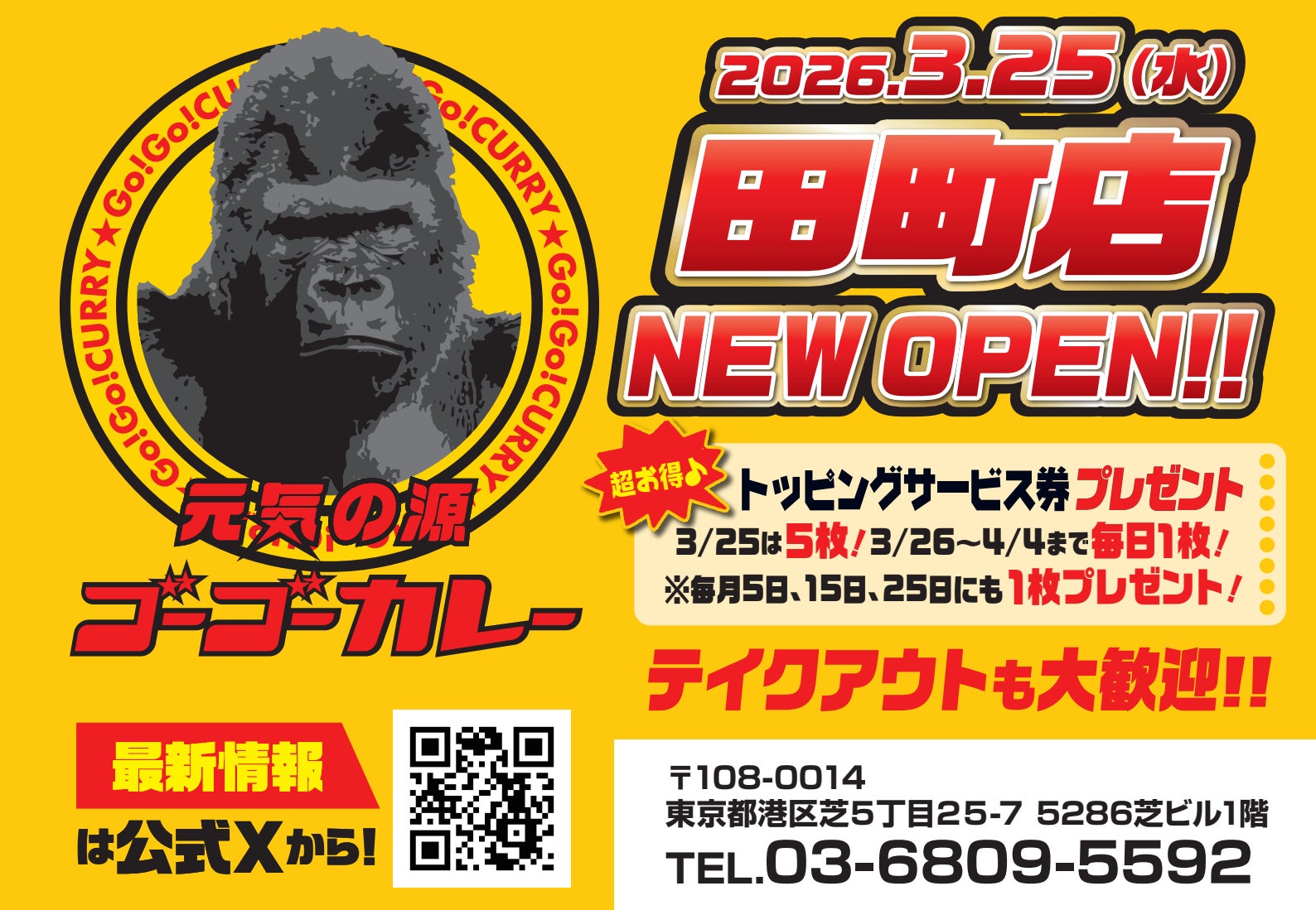 オープンを記念し、下記日程でトッピングサービス券をプレゼントいたします。まだゴーゴーカレーを知らない方にも。 そして「この春から新たに田町・三田エリアで新生活を過ごす」という方にも「元気」をお届けすべくご用意したキャンペーンになりますので、この機会にぜひ足をお運びください。