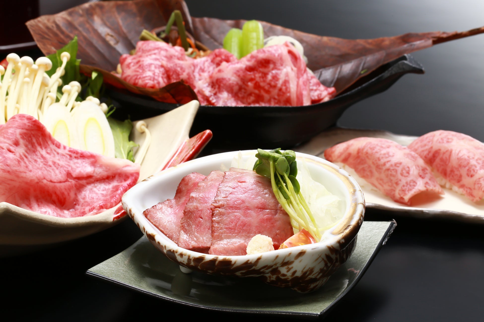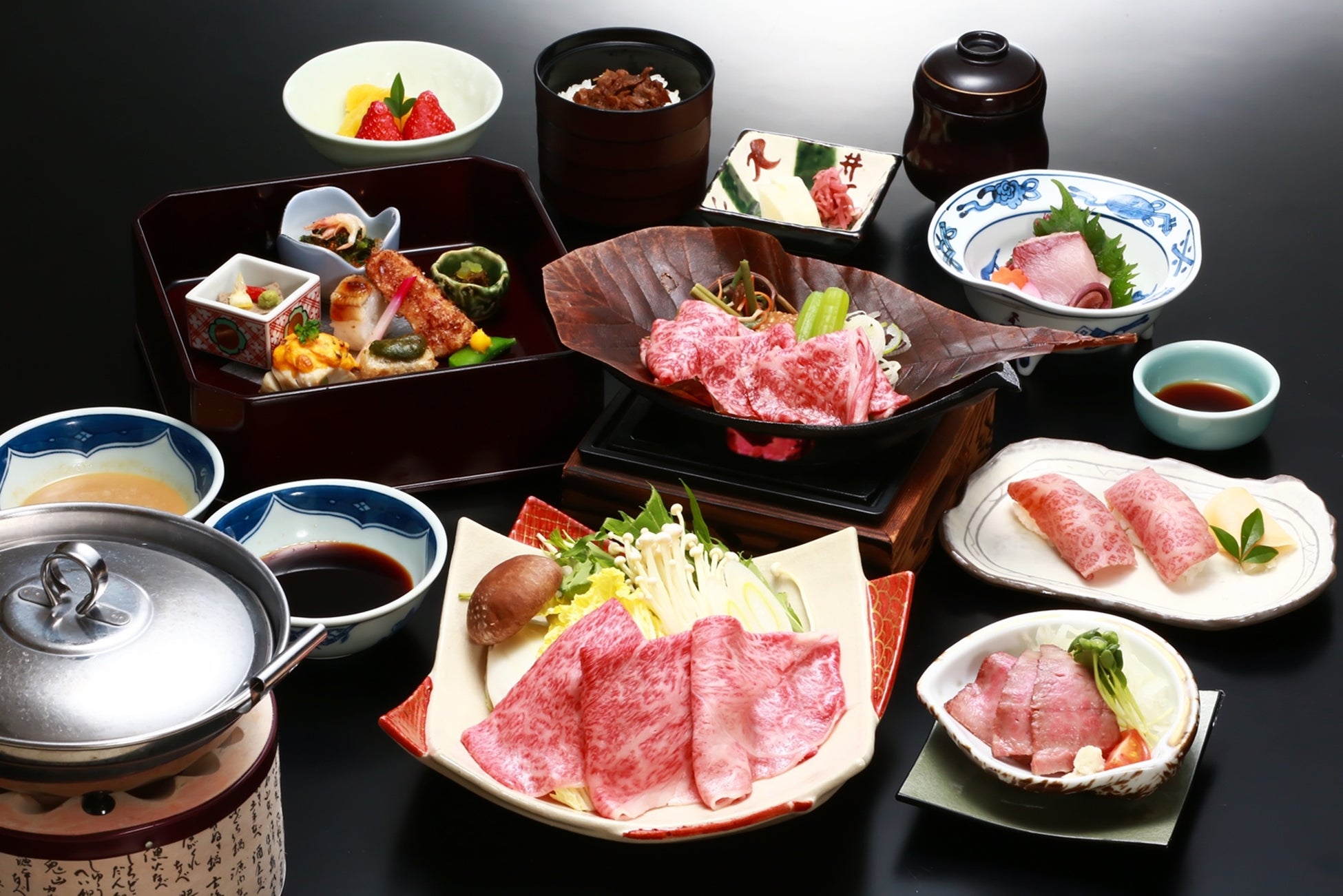 ご夕食の『飛騨牛づくし御膳』では全部で5種類のA5等級飛騨牛メニューをご提供いたします。飛騨牛の炙り寿司やローストビーフ、飛騨高山の郷土料理である朴葉味噌焼きに加えて、しゃぶしゃぶやしぐれ煮をご堪能いただけます。