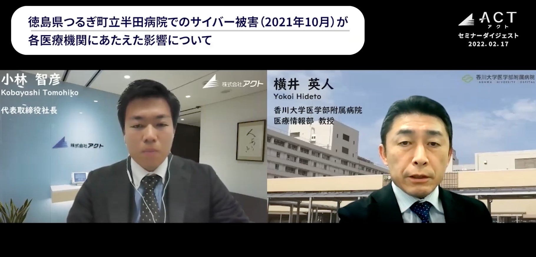 今回のウェビナーでは香川大学医学部附属病院 医療情報部 横井教授をゲストに迎え、医療現場特有の問題や、日本医療のサイバーセキュリティ課題について当社代表の小林と対談させていただきました。