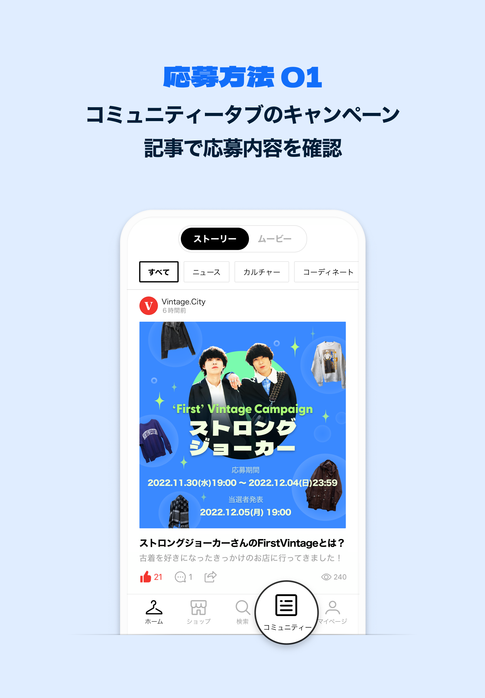 STEP1.ヴィンテージ・ファッション・アプリ「Vintage.City(ヴィンテージ・シティ)」内の「コミュニティ」ページに公開される「キャンペーン記事」で応募内容を確認。