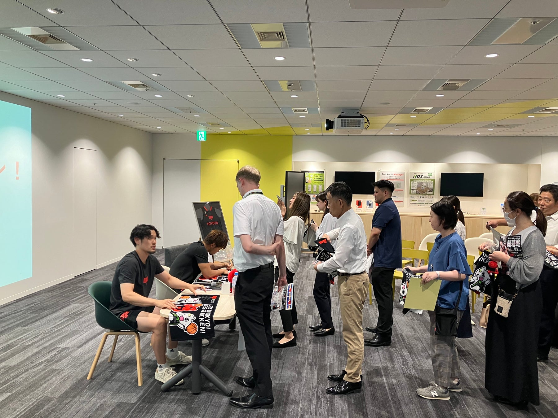 当日、イベント開催前には、執務室に突撃訪問いただき、写真撮影やサイン対応をしていただきました。その後は、イベント会場に移動し、2023-24シーズン終了報告や、岡本選手、福澤選手からのご挨拶、サイン・写真撮影会なども実施され、イベント終了後には、参加者全員での写真撮影も行われました。イベントの目玉は、当社社員と選手による「お絵描き伝言ゲーム」「ルークとじゃんけん大会」で、選手たちの意外な特技も垣間見ることができ、大いに盛り上がりました。