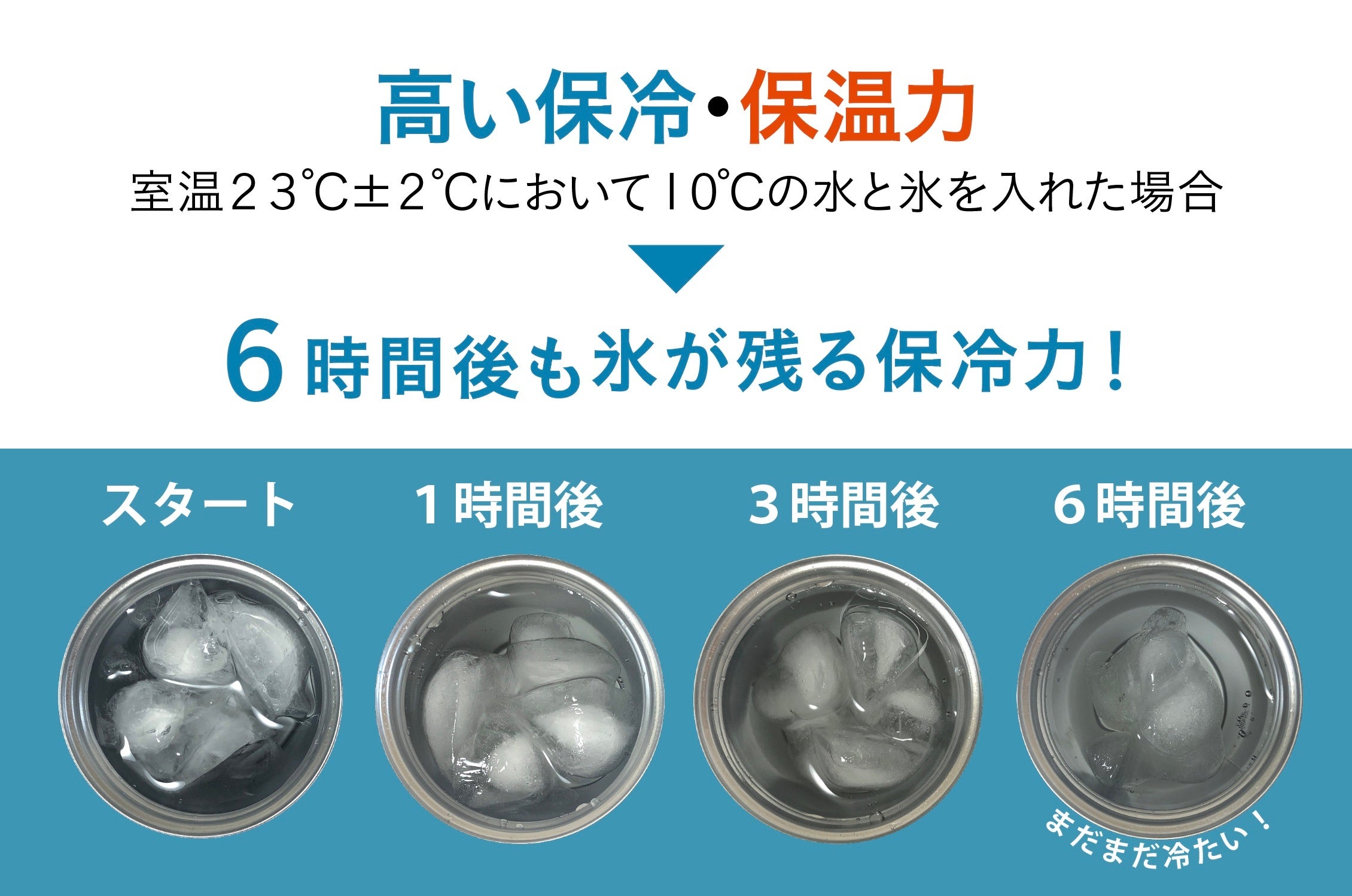 氷を入れて実験したところ、なんと6時間後も氷が残っていました!(※自社調べ)