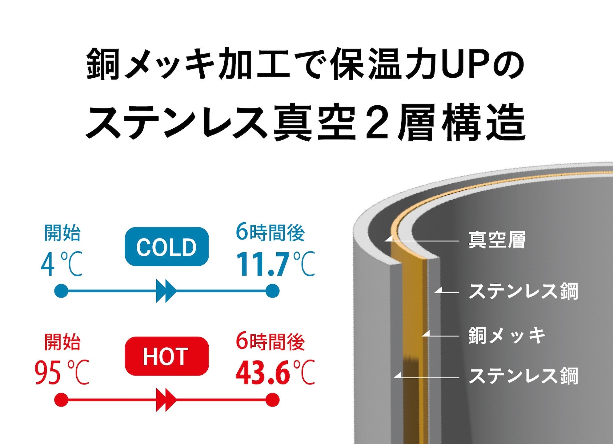 - ステンレス2層構造と銅メッキ加工で高い保冷&保温力を実現