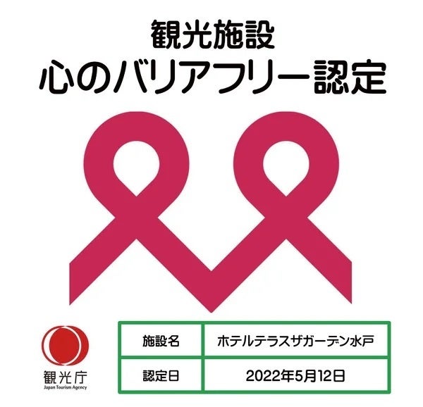 ホテルテラスザガーデン水戸はバリアフリー対応や情報発信に積極的に取り組む姿勢のある観光施設を対象とした「観光施設における心のバリアフリー認定制度」の認定を得た宿泊施設です。ご高齢の方や障害のある方がより安全で快適な旅行をするための環境整備に努めております。