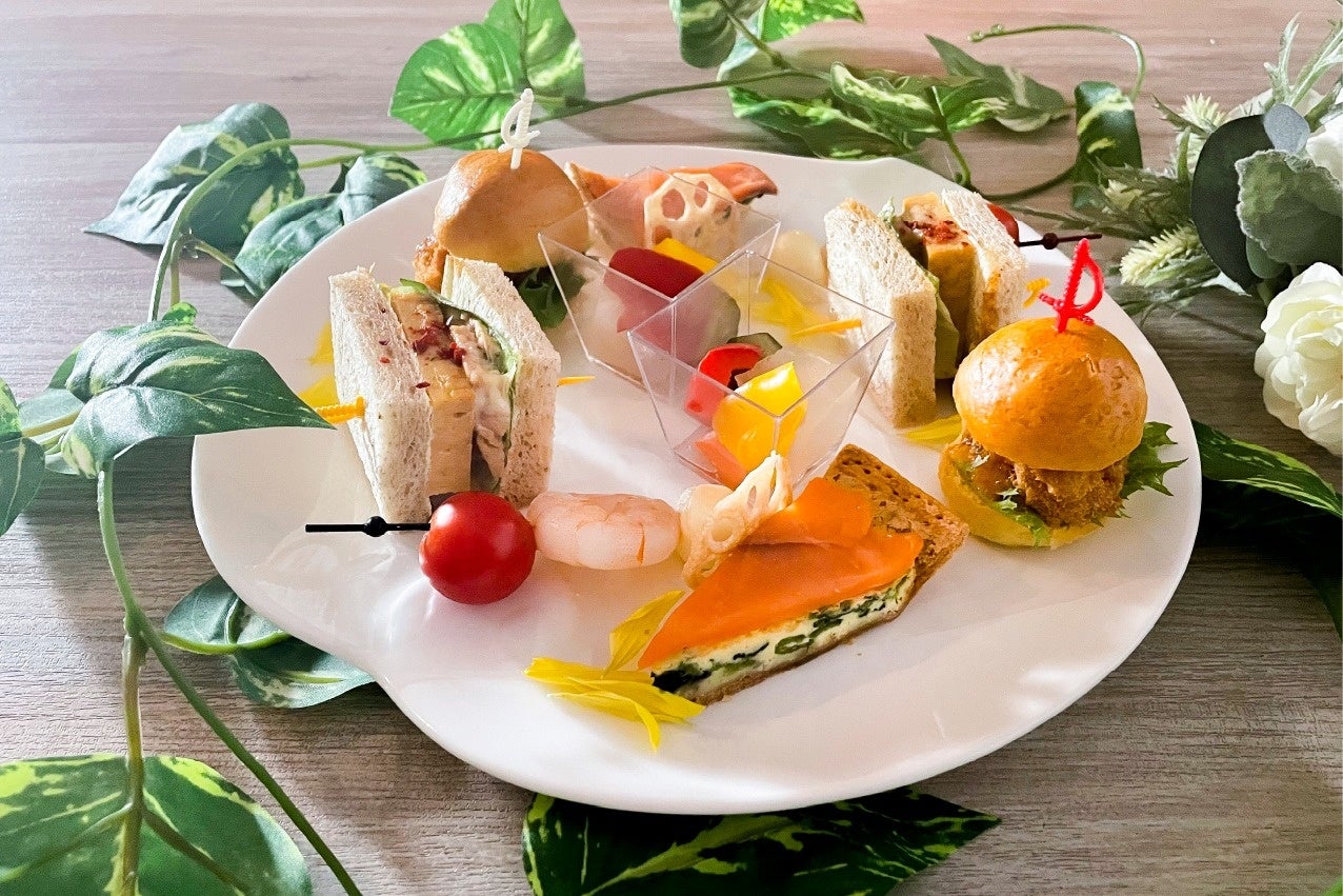 奥久慈卵の厚焼玉子と照焼チキンのサンドウィッチ/ブリオッシュのヒレカツ胡麻味噌バーガー/スモークサーモンのキッシュ/海老とモツァレラチーズのピンチョス/カラフルピクルス/本日のスープ