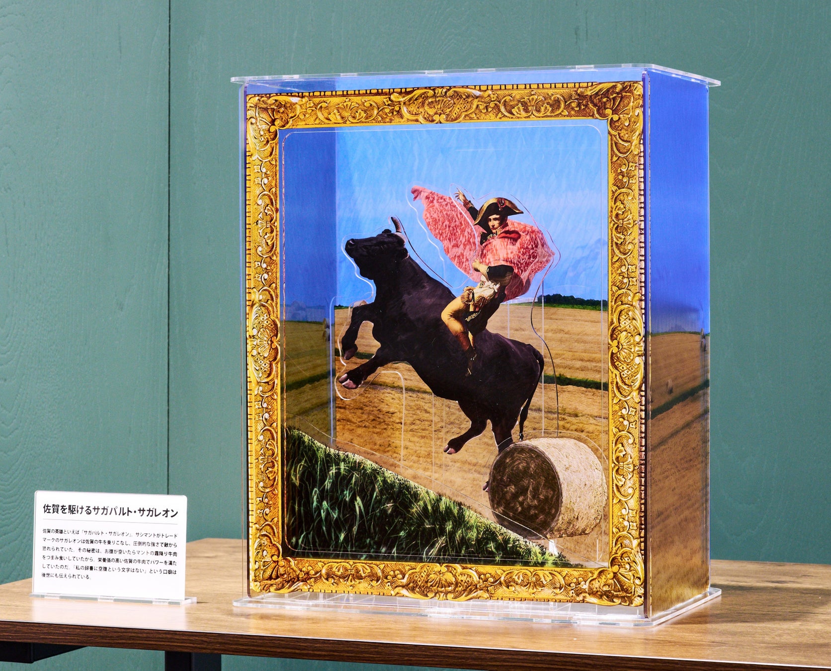 今回展示する作品は、「ワラスボの叫び」、「佐賀酒を注ぐ女」、「佐賀を駆けるサガバルト・サガレオン」、「散歩、バルーンフェスタに来た女」、「有田焼とひまわり」、「七ツ釜巨大イカ伝説」、「超獣ガタリンピック」、「記憶の蓮根」の8点。また、作品の関連商品が「sagair」にあります。