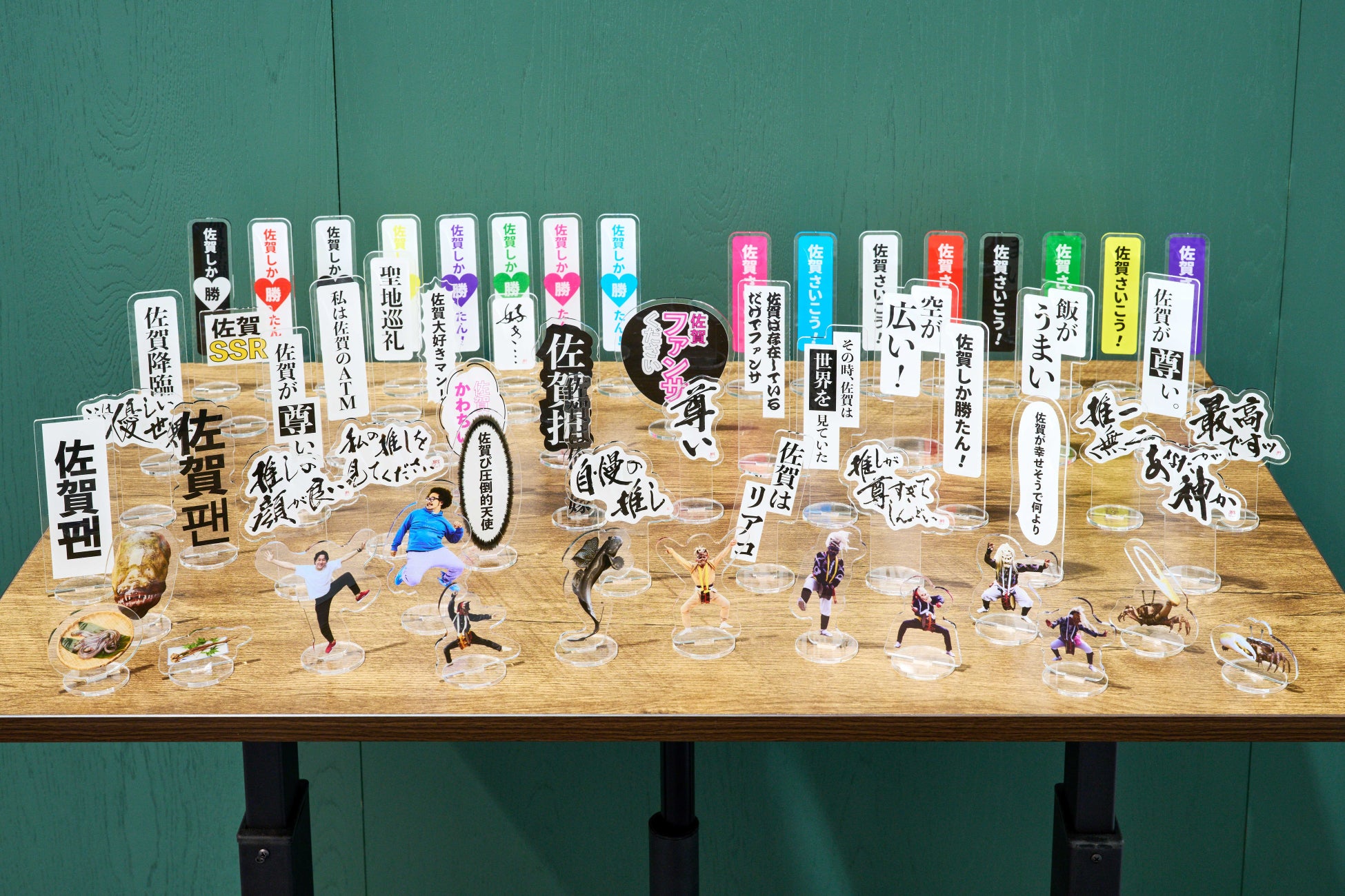 8点の作品に加えて有明海の「ワラスボ」「ムツゴロウ」「シオマネキ」伝承芸能「面浮立」や、佐賀推しクリエイター「ヨッピー」「アフロマンス」、佐賀県出身の書家「江島史織」による推し文字など、全76個のアクスタをご用意。