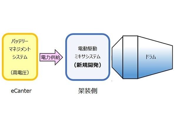 今回実装した電動化ミキサシステムは、従来のディーゼル車でドラムを駆動する際に必要としていた動力取り出し装置(PTO)を不要とし、EVトラックの高電圧バッテリー電源を直接供給源とすることで軽量化や低騒音化を実現しています。