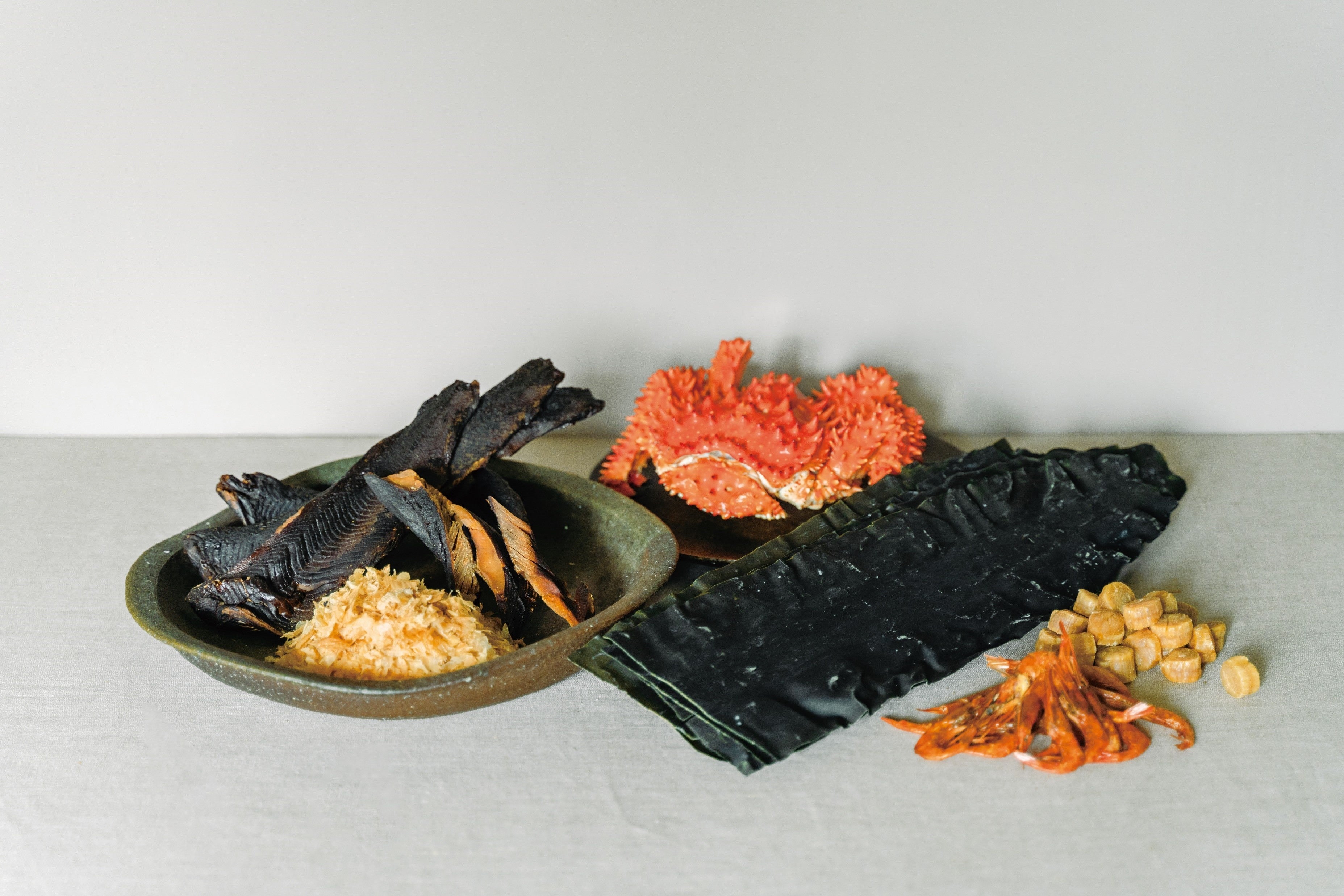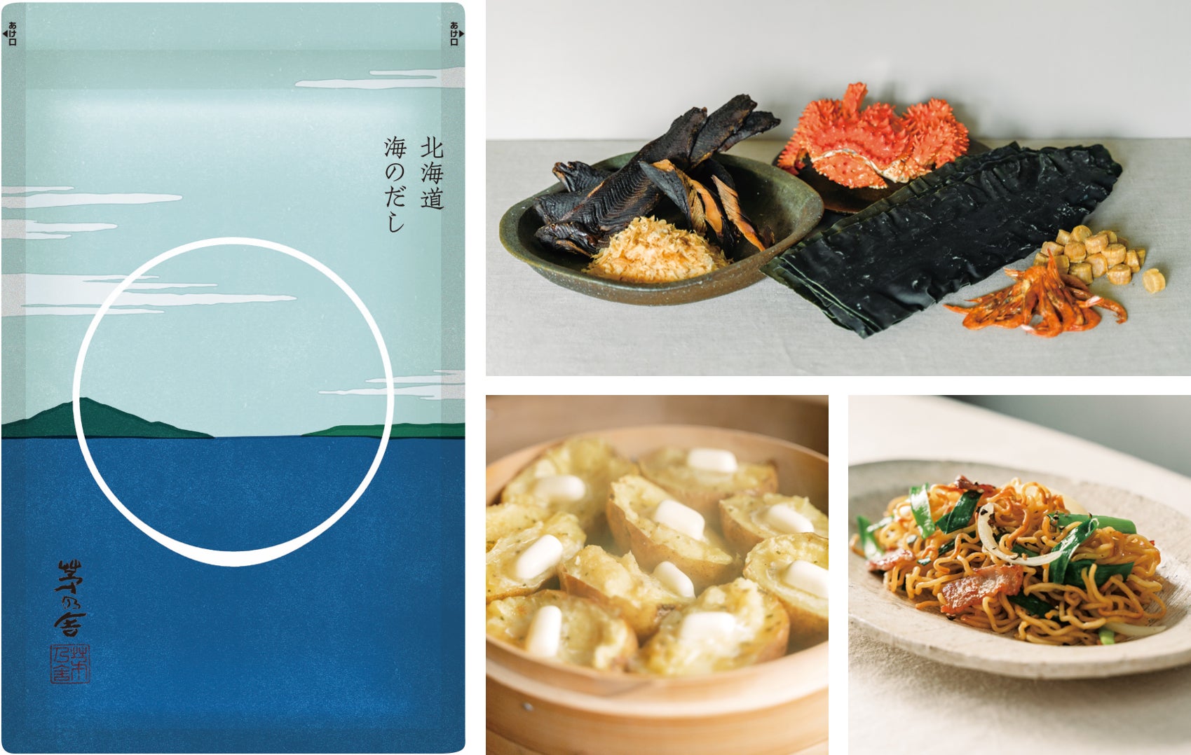 鮭節、花咲蟹、昆布、ほたて、海老と、北海道の豊かな海の幸を贅沢に使用しただしです。中でも燻しをかけた「鮭節」は、うまみも甘みも別格な食材。加えて、蟹や海老といった甲殻類の芳しさ、ほたてと昆布のコク深い味わいと、まさに北海道のうまみの代表格が集結しました。じゃがバターや焼きそばなど、いつもの料理も一段と本格的な海鮮風味に仕上がります。