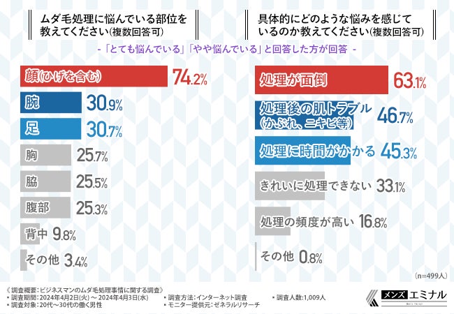 顔や腕、足といった部位のムダ毛処理が面倒で時間がかかるというお悩み以外にも、肌トラブルなど悩んでいるビジネスマンも多いという傾向が示されました。