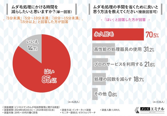 【ビジネスマンのムダ毛処理事情に関する調査】多忙なビジネスマンはムダ毛処理にかける時間は極力減らしたい?約7割が手間を省くなら永久脱毛が良いと回答