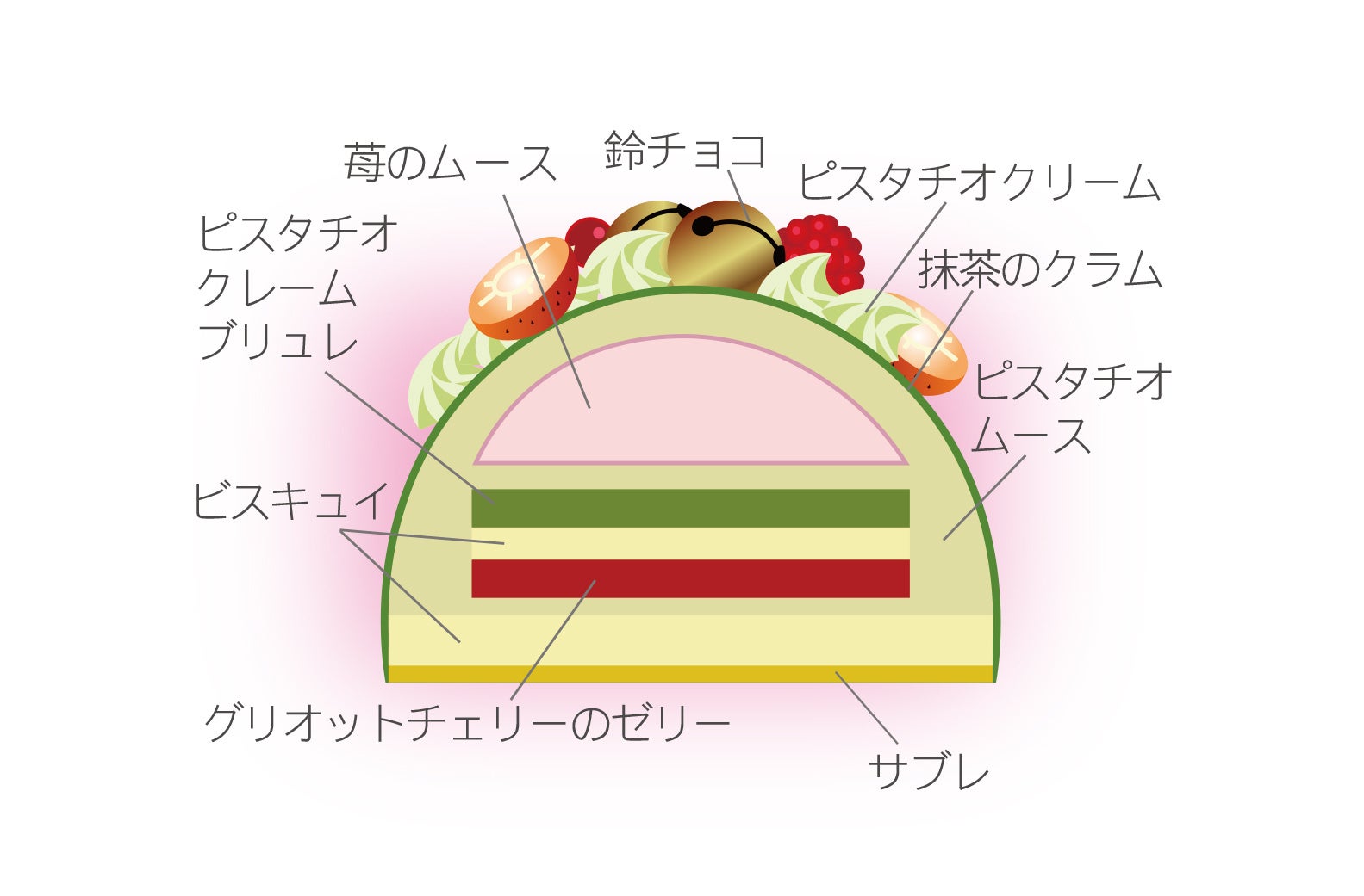 秋~春にかけての季節の移ろいをケーキに見立てた「苔玉」シリーズから、クリスマス限定の苔玉が登場です。ピスタチオと苺のムースを重ね、抹茶クラム(抹茶スポンジを細かく削ったもの)で包みました。どんぐりと鈴のチョコレートを添えた和のクリスマスケーキです。