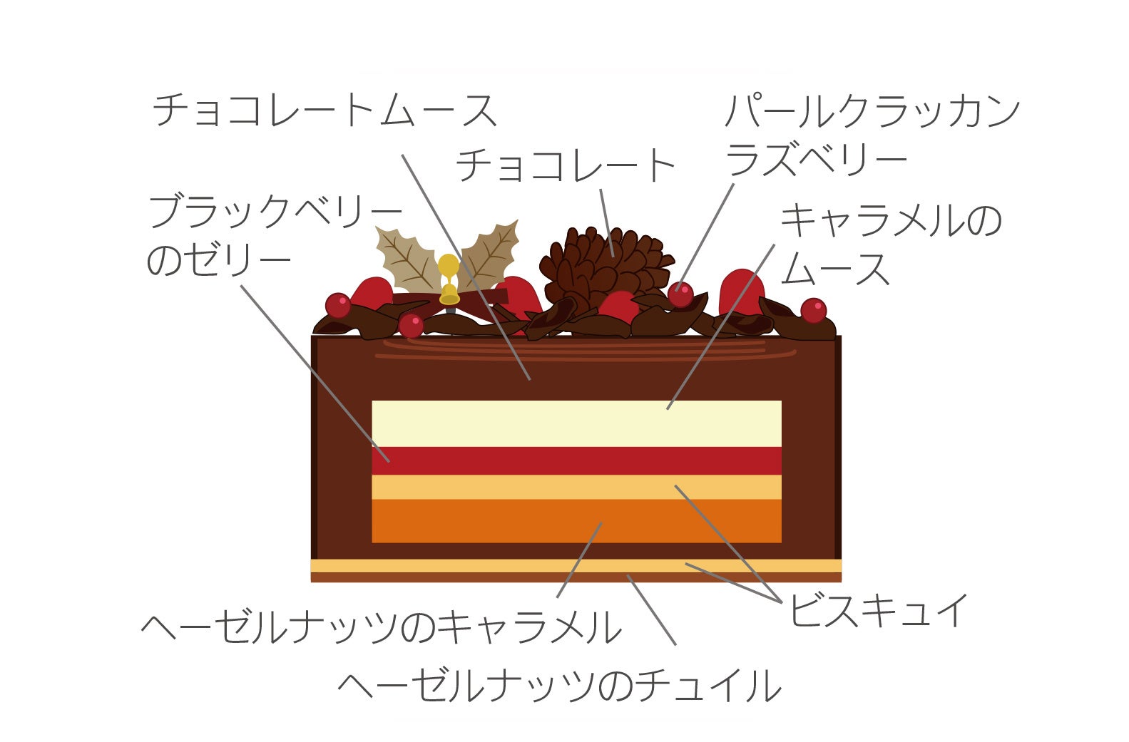 キャラメルムース、ヘーゼルナッツのキャラメルクリームが入った、切り株をイメージした、甘くほろ苦いキャラメルとチョコレートのムースです。ブラックベリーのゼリーが味のアクセントです。