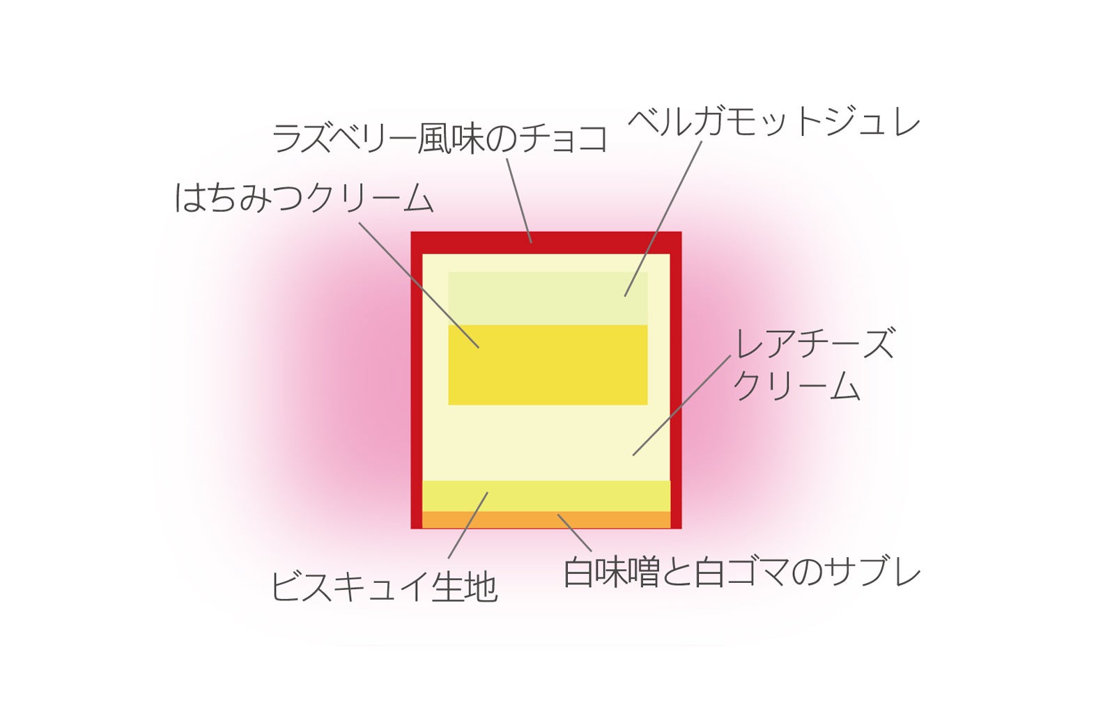 和素材を使用したレアチーズケーキ「壽‐ことほぎ‐」を特別なクリスマスケーキに仕立てました。ベルガモットジュレとはちみつのクリームをレアチーズクリームで包み、土台に白ごまと白味噌のサブレを合わせました。