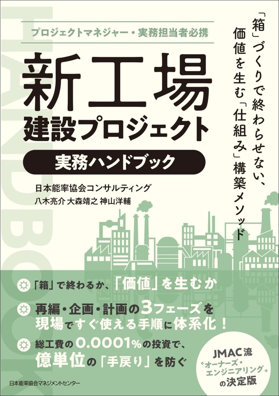 本書は、JMACの八木亮介、大森靖之、神山洋輔の3名による共著で、新工場建設における「オーナーズ・エンジニアリング」の真髄をまとめたハンドブックです。総工費のわずか0.0001%の投資で、将来的な億単位の「手戻り」を防ぐための知見が凝縮されています。