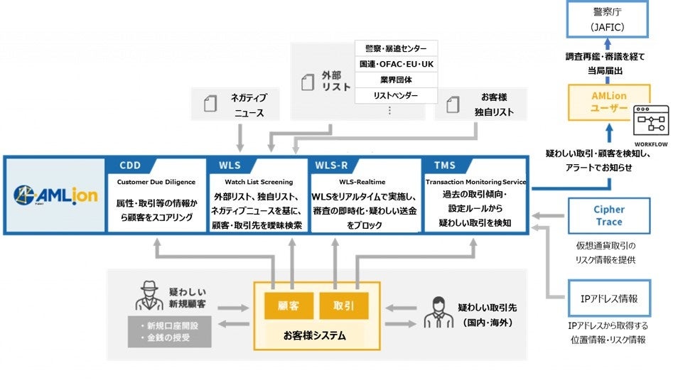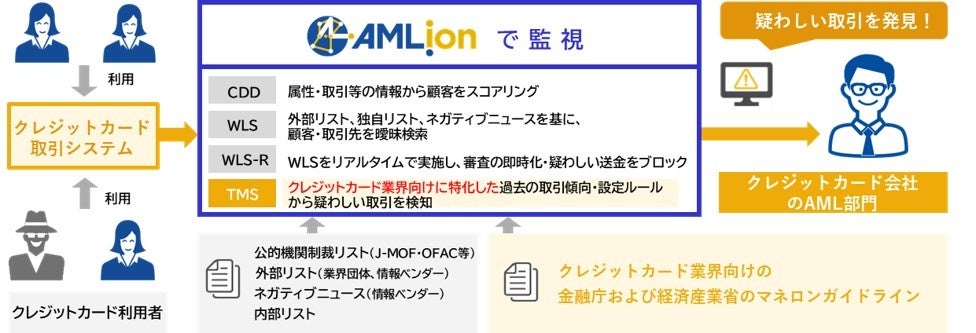 AMLionは、国内外の最新ガイドラインに対応したマネー・ローンダリング及びテロ資金供与対策(AML*1/CFT*2)パッケージソフトで、クレジットカード業界版ではクレジットカード業界向けの金融庁および経済産業省のマネロンガイドラインへの適合に特化しています。またDTSは、クレジットカード業界における30年以上のシステム開発の経験と、銀行・証券・仮想通貨・資金移動等でのAML/CFT製品導入実績があり、その実績から抽出したクレジットカード業界固有の要件とニーズにも対応しています。