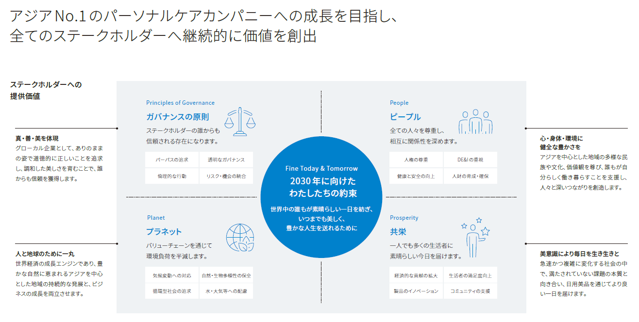 当社グループは、「世界中の誰もが、素晴らしい一日を紡ぎ、いつまでも美しく、豊かな人生を送れるようにすること」というパーパス(わたしたちの存在意義)と、その達成に向けた中長期ビジョン「Fine Today & Tomorrow 2030」に基づき、サステナビリティ(持続可能性)に資する様々な取り組みを、創業以来、事業運営と一体的に推進してきました。