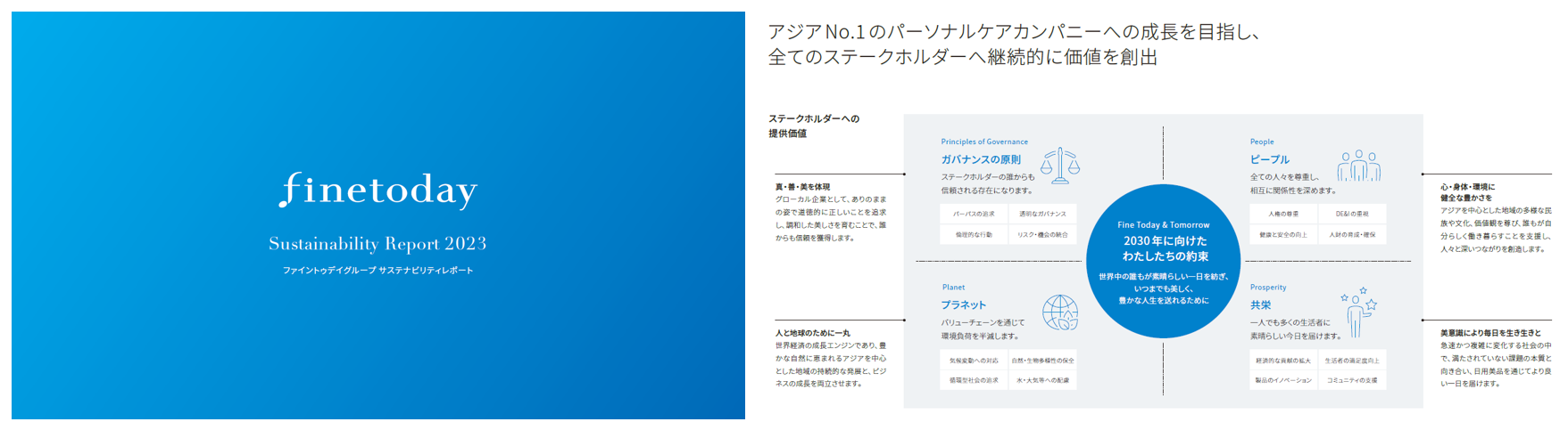 当レポートでは、トップメッセージに加え、「Fine Today & Tomorrow 2030」の柱を構成する4つの領域(ガバナンスの原則、ピープル、プラネット、共栄)に関する具体的な取り組みなどを紹介しています。