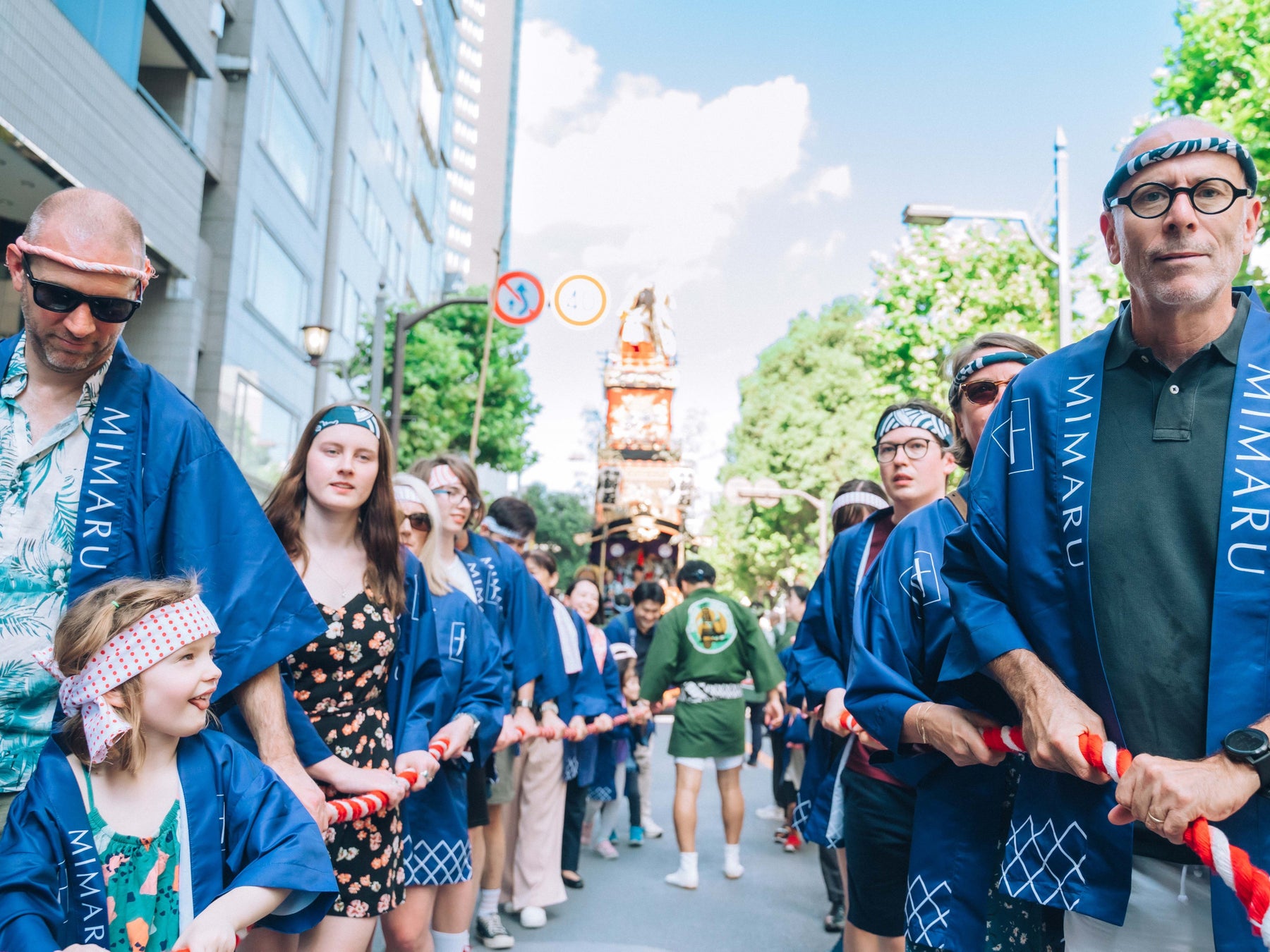 東京:赤坂氷川祭で、海外ゲストが法被を来て、地元の方々と一緒に山車の曳き回しに参加