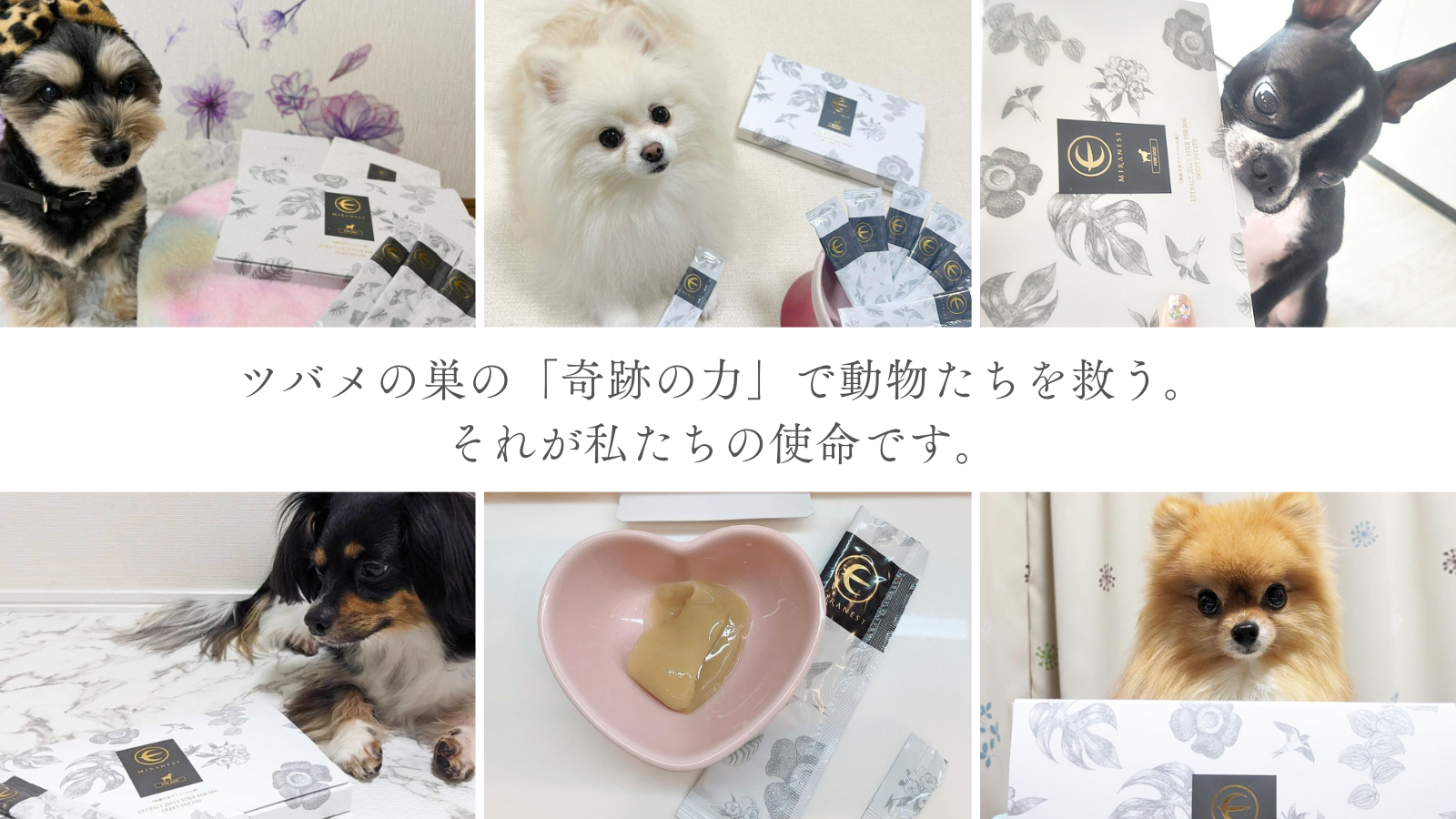 BI-SUは人々の治療や医療にツバメの巣が役に立つとして国立大学と共同研究を進めており、次々と新しいエビデンスを取得し、特許出願にもつながっております。その知見を生かし、同じく病気で悩む動物たちも助けたいという想いからMIRANEST株式会社を設立しました。薬に頼らない未来をつくる。ツバメの巣の「奇跡の力」で動物たちを救う。それが私たちの使命です。姉妹ブランドである「BI-SU」同様、全商品に天然アナツバメの巣を原料とした、独自の高濃度エキスを使用しています。