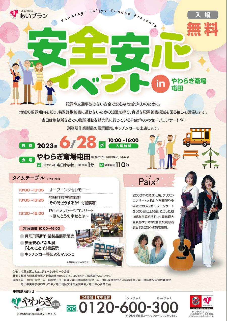 地域の安全安心を目指して、皆様にご参加いただける「安全安心イベントinやわらぎ斎場屯田」を開催!メッセージコンサートや防犯セミナーなど。入場無料
