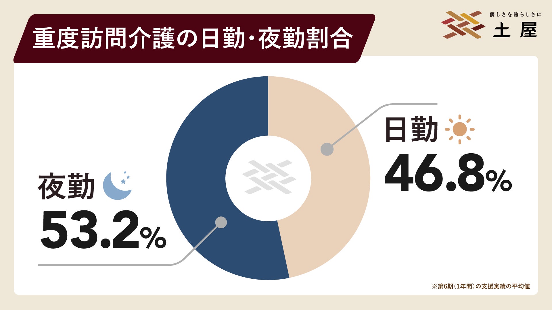 土屋の重度訪問介護事業では、日勤と夜勤の支援割合がほぼ同程度となっており、24時間体制のバランスの取れた在宅生活の支援を行っています。