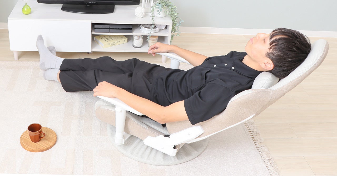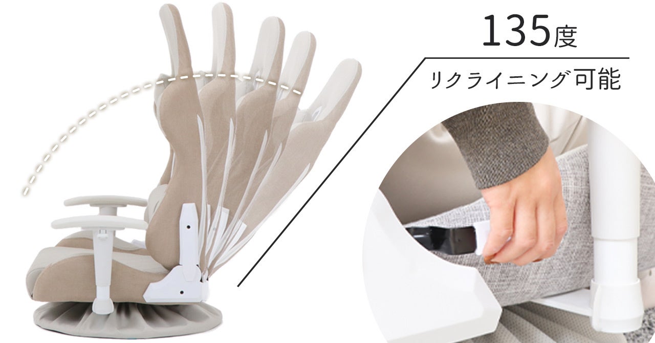 シート横のレバーで135度までリクライニングが可能。グーっと身体を伸ばしてリフレッシュ&リラックス。
