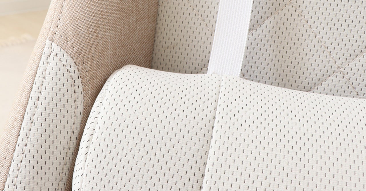 体か触れる部分は通気性のいいメッシュ生地。アクセントになったファブリック生地はお部屋に溶け込むカラー。優しいコントラストがうまれました。