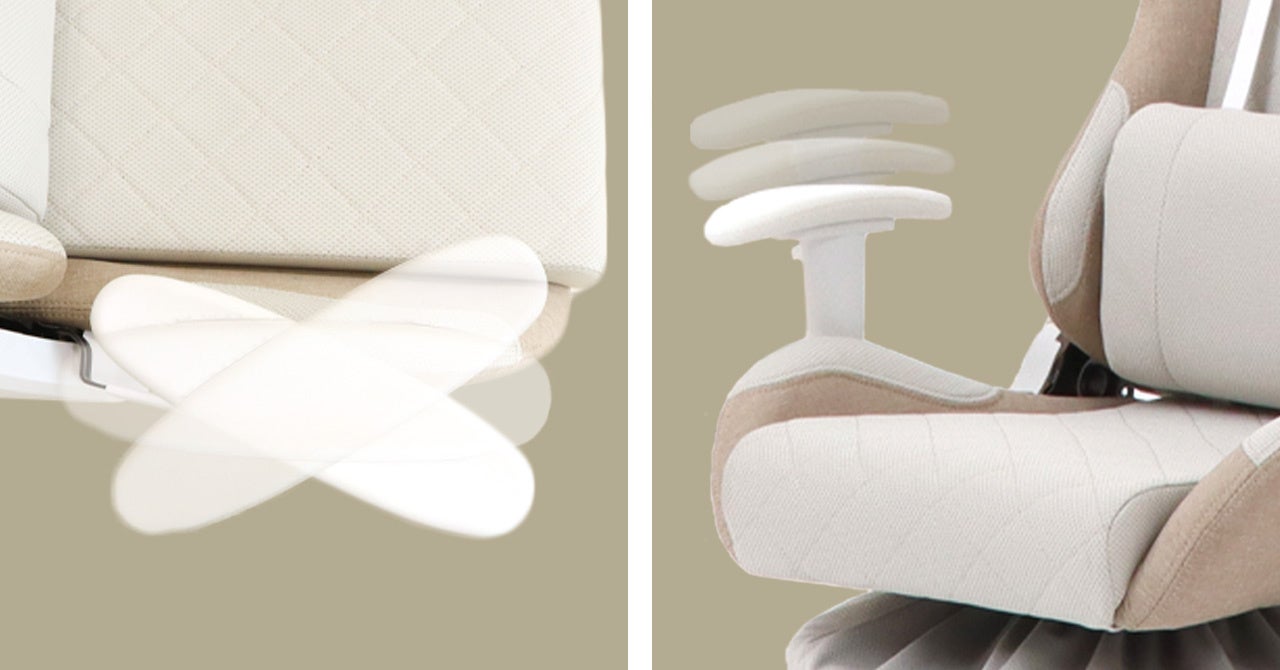 明るいトーンのファブリックシートとこだわりの白いパーツが、ゲーミングチェアなのにふわっと優しい雰囲気に仕上げています。白を基調としたホワイトインテリアやナチュラルインテリアの部屋にも馴染みます。