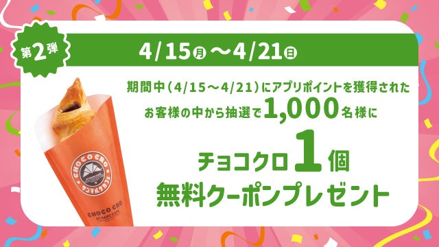 第2弾は、期間中にサンマルクカフェをご利用いただきアプリポイントを獲得されたお客様の中から、抽選で1,000名様に「チョコクロ1個無料クーポン」をプレゼントいたします。