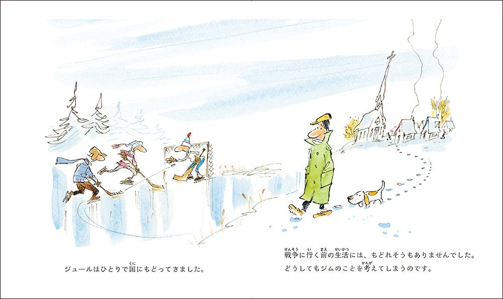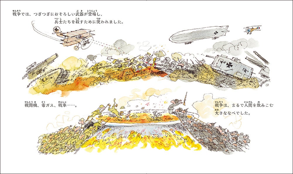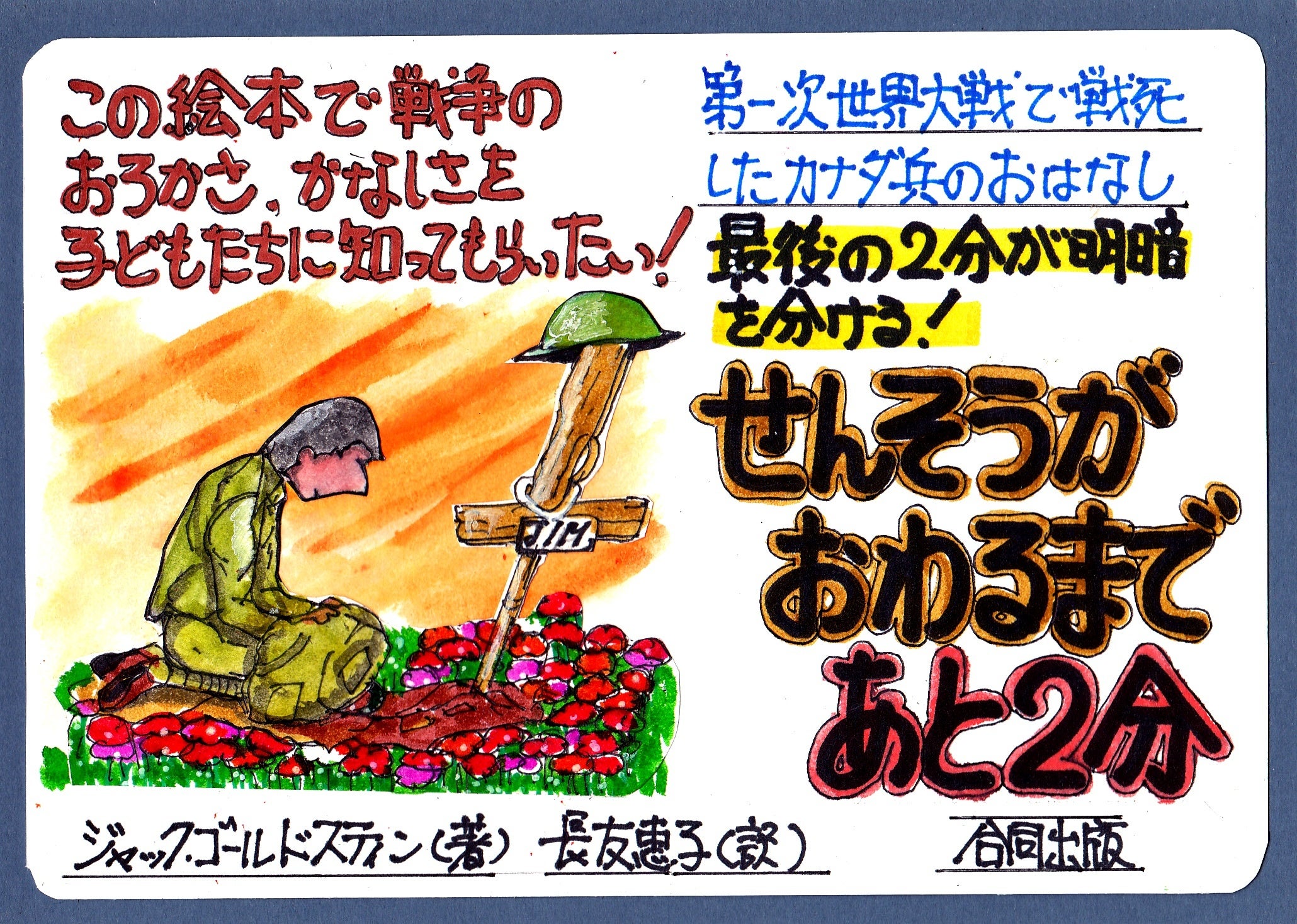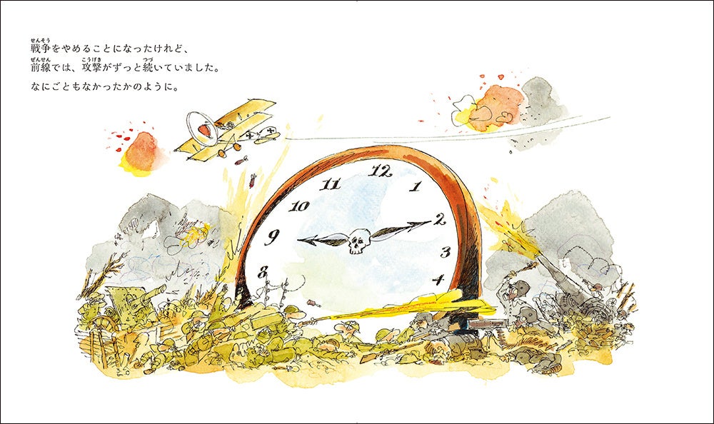 このエピソードをもとに作られた絵本『せんそうがおわるまで、あと2分』は、戦争がいかにおろかな選択であるかを、あたたかく、シンプルなタッチで、子どもたちに訴えます。