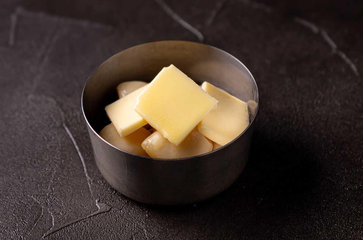 焼き台の上にのせ、バターがオイル状になるまでにんにくと一緒にグツグツさせれば完成。そのままでも、焼肉をつけて食べてもお楽しみいただけます。