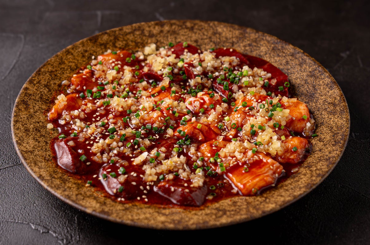 鮮度が自慢のマルウシミートの人気メニュー「ホルモンMIX」に、たっぷりとにんにくをのせた、今だけの限定メニューです。