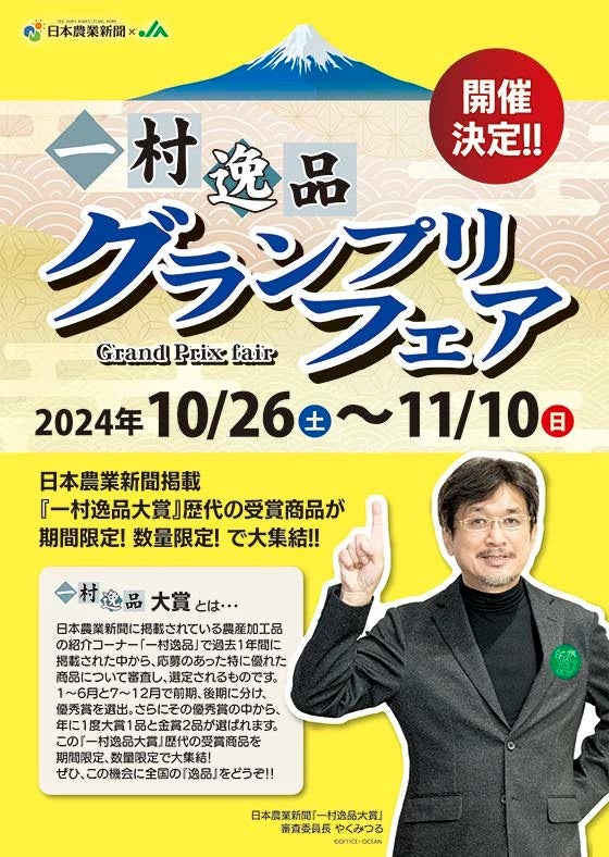 各地の優れた加工品などを紹介する日本農業新聞の人気企画「一村逸品大賞」の受賞商品を集めたグランプリフェアが10月26日から神奈川県内の7JA、計12店舗の直売所で始まりました。地域の優れた六次化商品、加工品を全国に発信しようと1994年に始まった「一村逸品大賞」が今年で20回を迎えたことから日本農業新聞とJA全農が企画し、JA全農かながわが全国で初めて主催します。