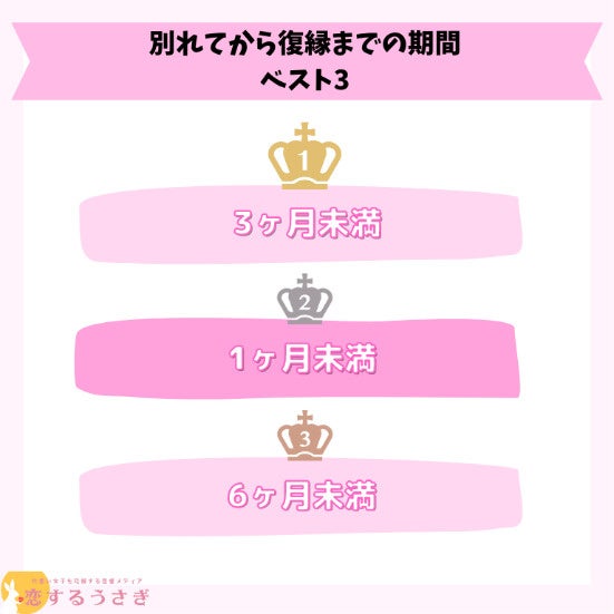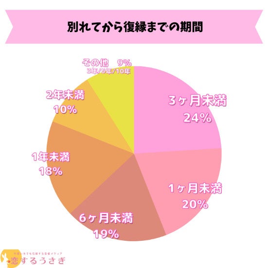 恋するうさぎ編集部が行った「別れてから復縁までの期間」のアンケートによると1位3ヶ月未満が24%、 2位は1ヶ月未満が20%、3位は6ヶ月未満が19%という結果になりました。