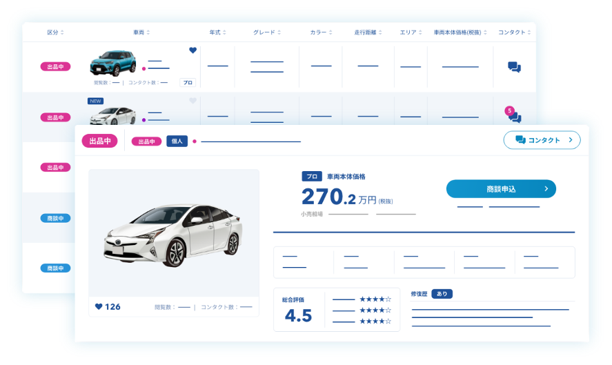 国内外の全メーカー全車種を顧客が利用中の ライド車(管理車両)と共有在庫(中古車)から取引できる革新的なマーケットプレイスで利益増・顧客増・効率増に貢献します。