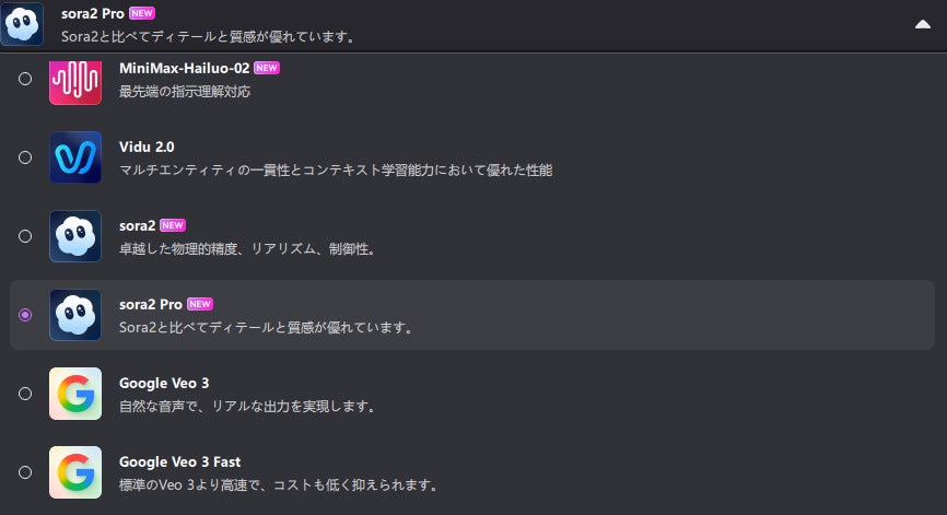 最新のVeo3/Veo3 Fast/Sora2/Sora2 Pro/Hailuo モデルなど、用途に合わせてモデルを選択すれば、表現力の高いアニメーションを作ることも可能。