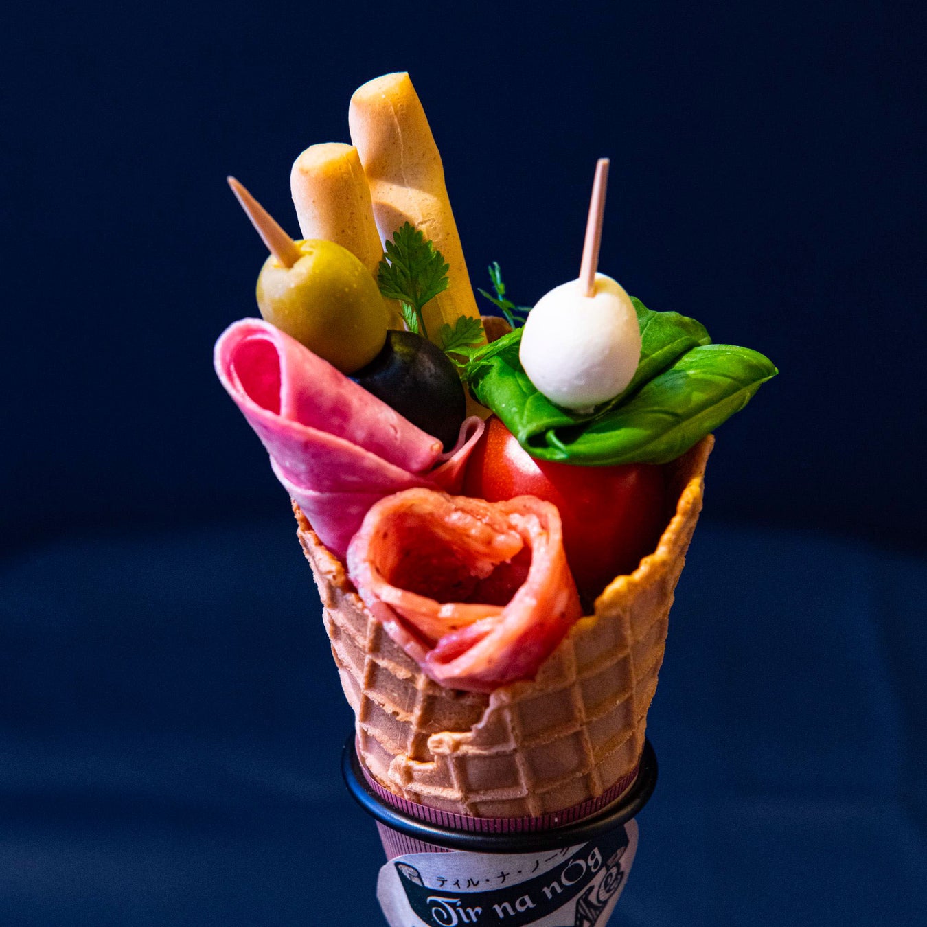 サラミ、カプレーゼ、オリーブなどをひとつにまとめワッフルコーンに詰め込んだ贅沢なアンティパスト。まるで花束のように色鮮やかな盛り付けが、華やかなパーティーにぴったりです。
