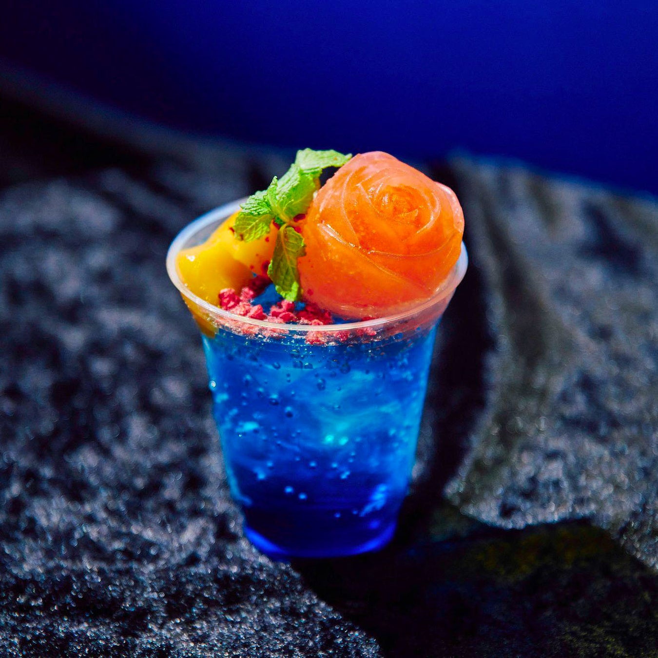 アリスが身に纏うエプロンドレスの青色と、ハートの女王が愛する真っ赤な薔薇をイメージしたラズベリーカクテル。不思議の国の女性たちのようにインパクトのある色合いが印象的です。