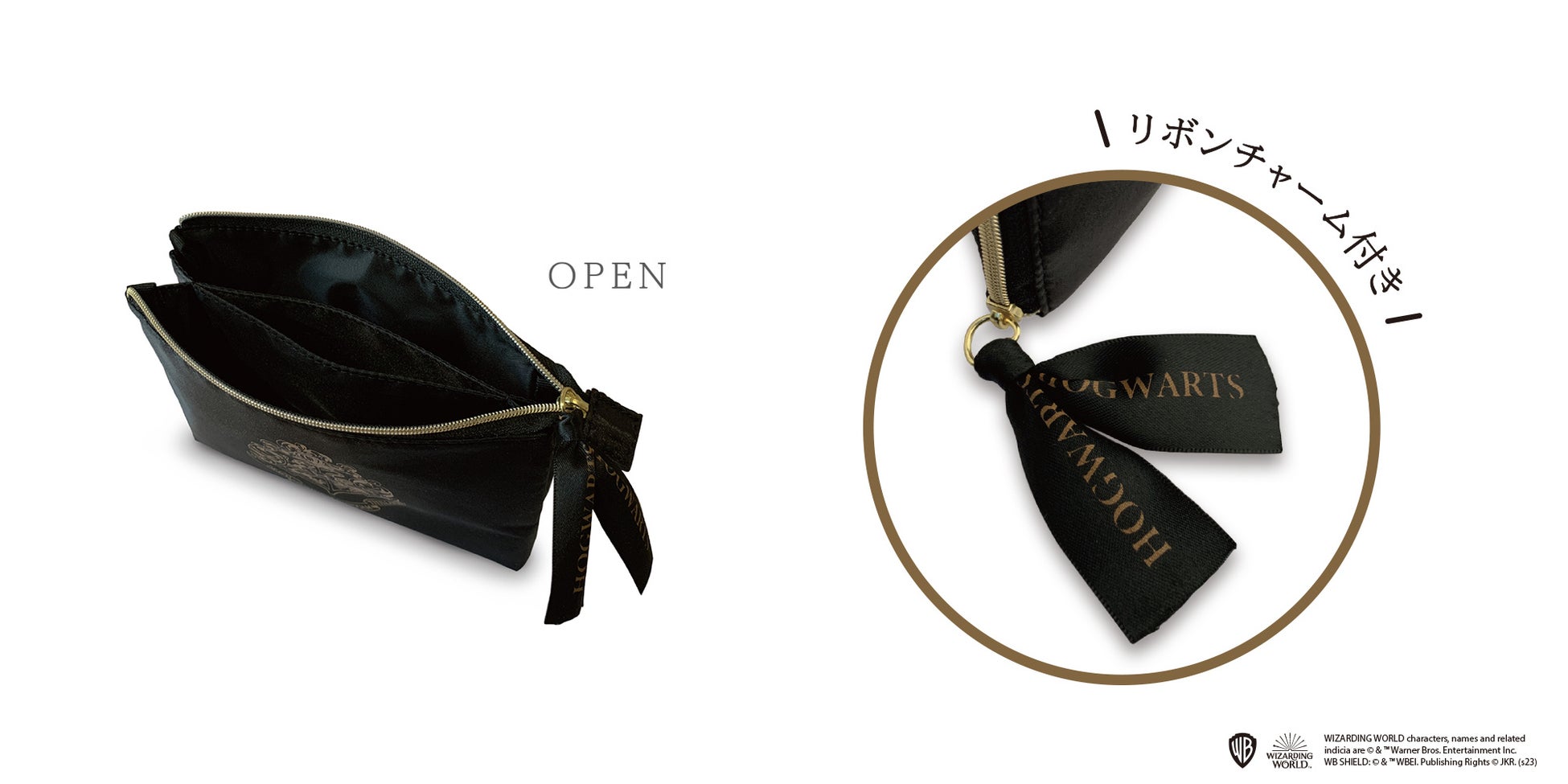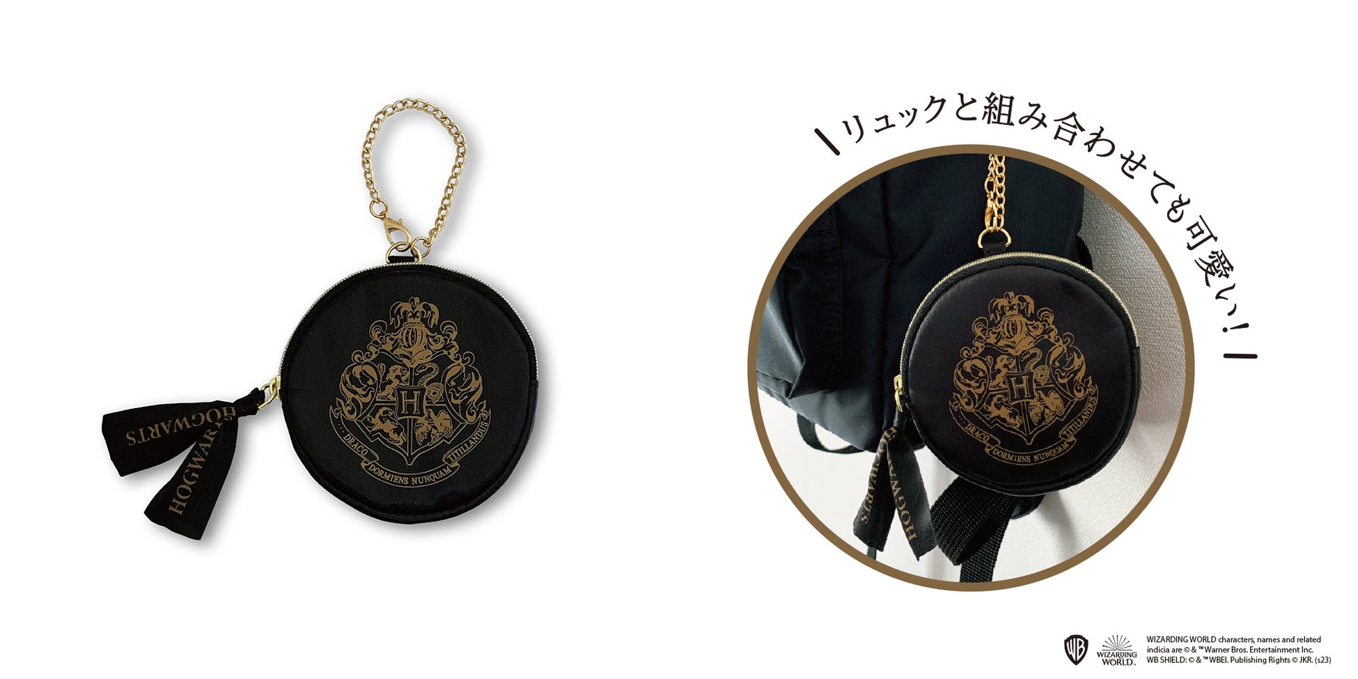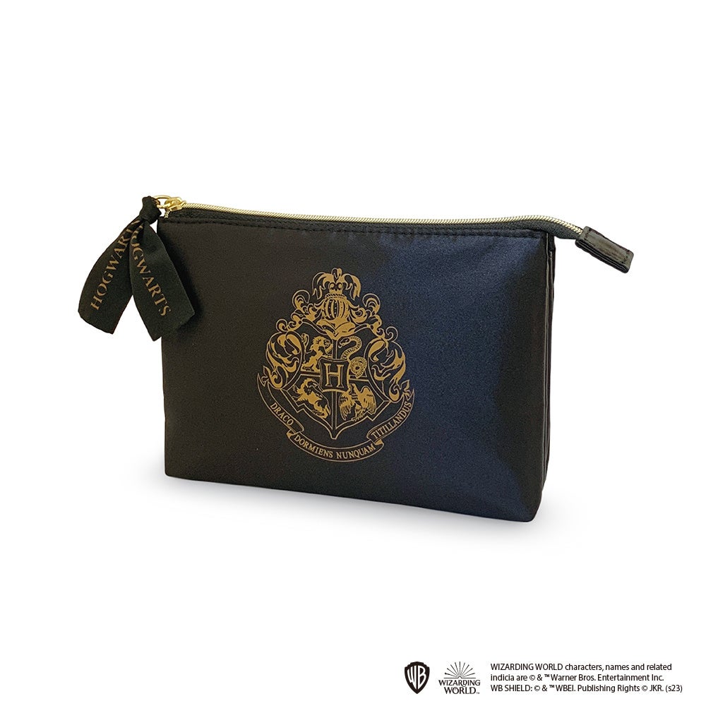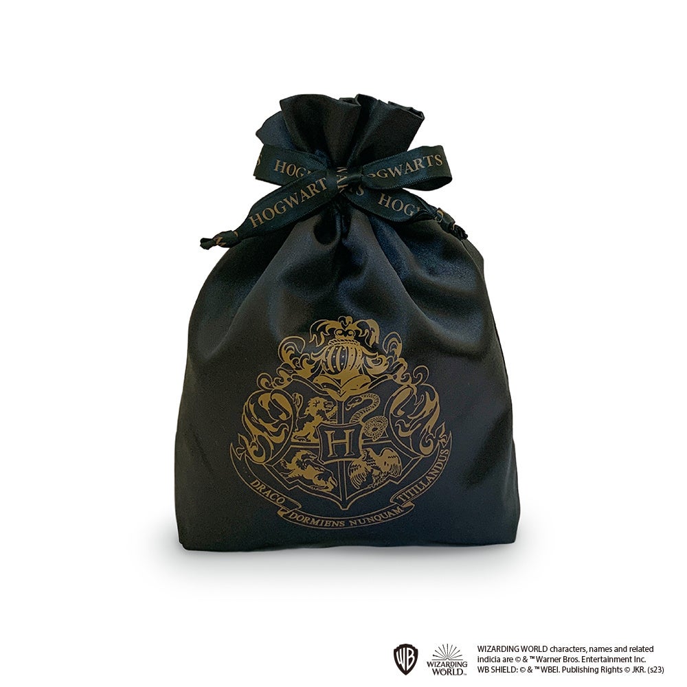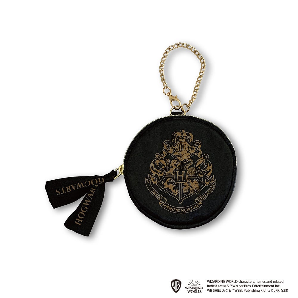 「ハリー・ポッター 縫製シリーズ」では、艶のあるブラックの生地を使用し、大きくプリントされたホグワーツの紋章が印象的な3ポケットポーチ、ラウンドポーチ、巾着、リュックサックの4アイテムを展開します。ゴールドのジッパーやチェーン、ホグワーツの文字がプリントされた黒のリボンがさりげないアクセントになっています。