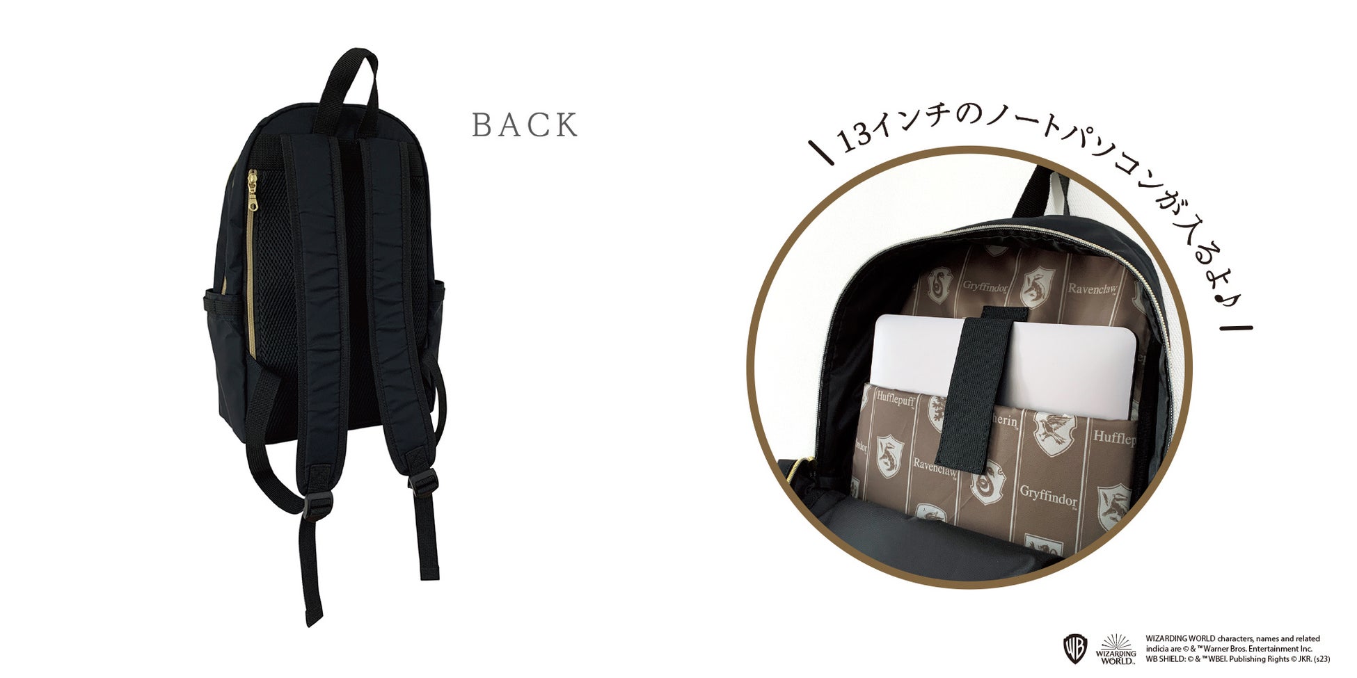 13インチのノートパソコンが入るリュックサックです。本体部分はダブルファスナー式で開閉に便利な仕様となっており、背面のファスナーからも荷物の出し入れが可能です。またリュックの内側はホグワーツの4つの寮を象徴する動物たちがプリントされています。