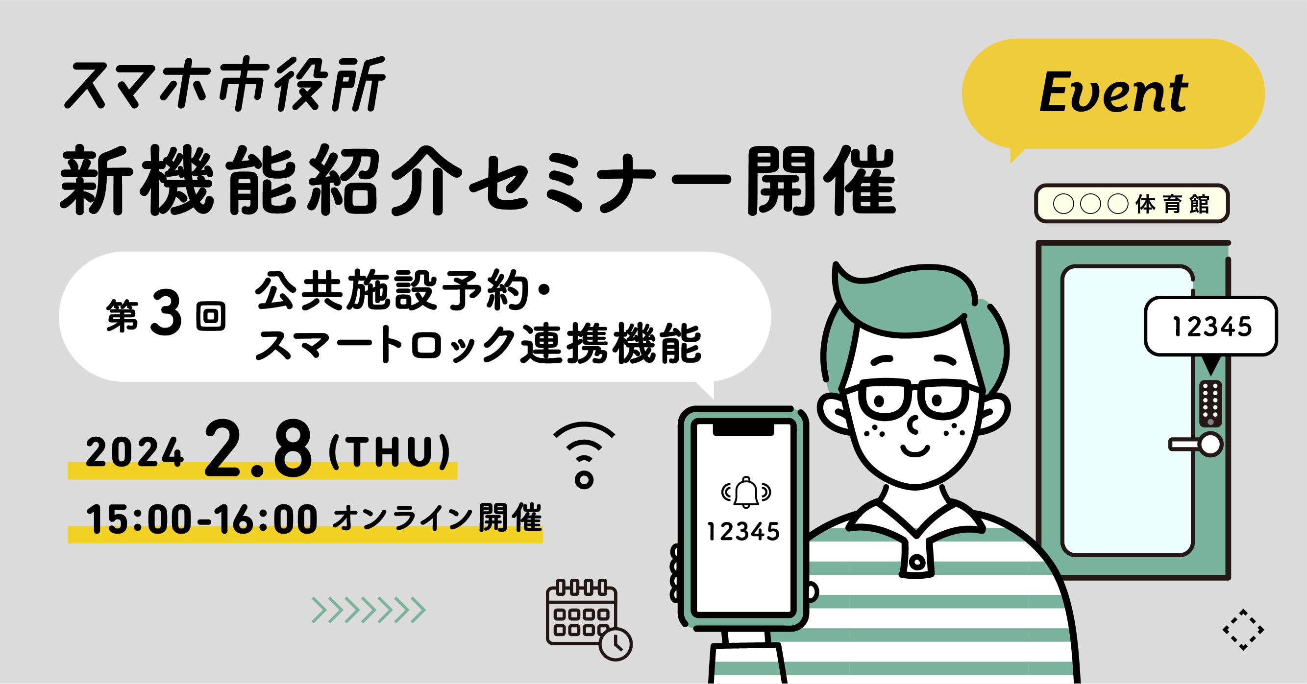 2月8日(木)、スマホ市役所の新機能紹介オンラインセミナーを開催。テーマは「公共施設予約・スマートロック連携機能」