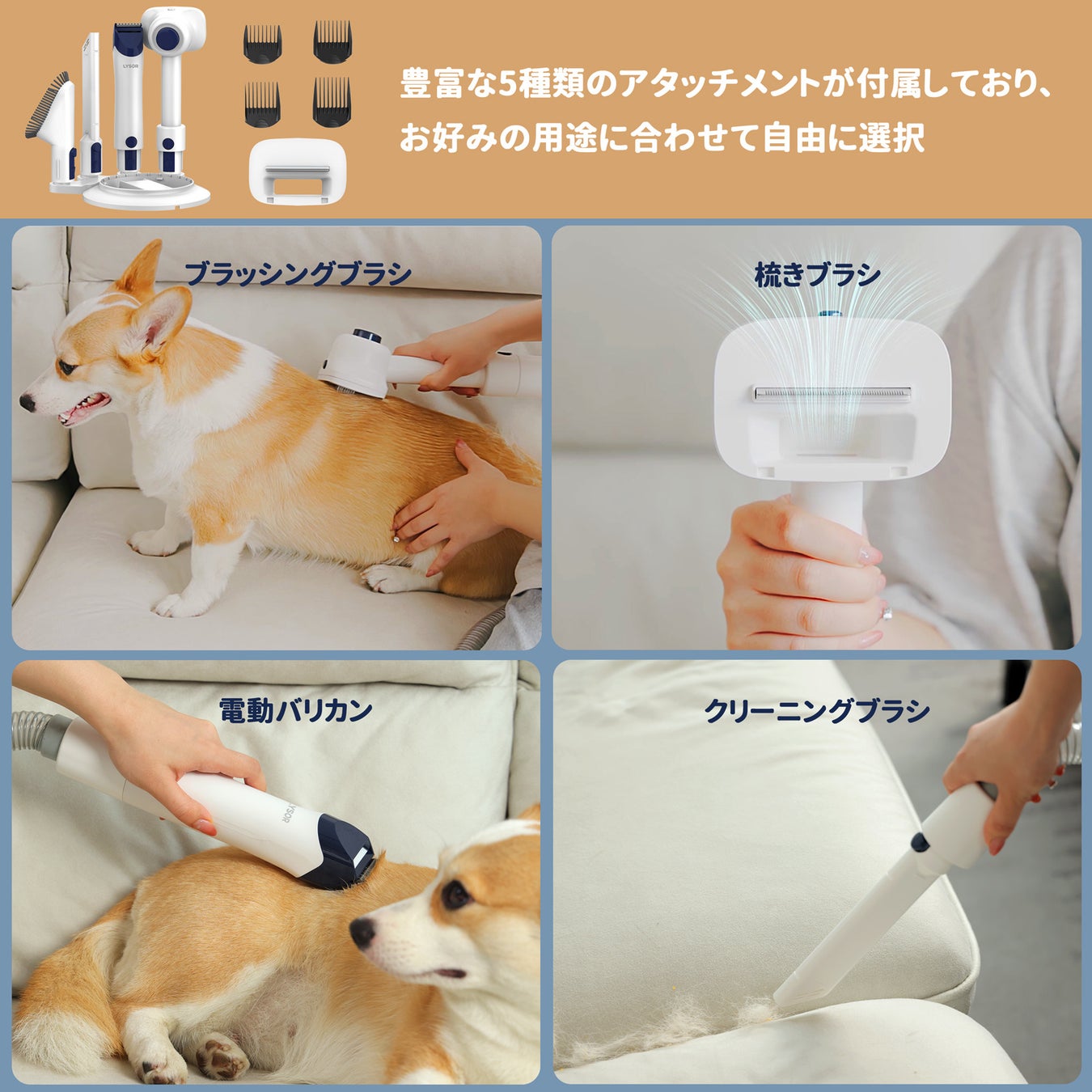 【多機能&5種類のアタッチメント】換毛期が過ぎてもこまめなお掃除はかかせません。犬や猫のストレス対策としては、①ブラッシング②トリミング③クリーニング、などがあり、日頃からしっかりとケアをすることが大切です。「グルーミングブラシ」「梳きブラシ」「電動バリカン」「掃除用ブラシ」「隙間ノズル」備わった、5種類のアタッチメントから「ブラッシング」「毛を梳く」「足裏などのバリカンカット」「清掃」の4つの用途に使い分けることができます。