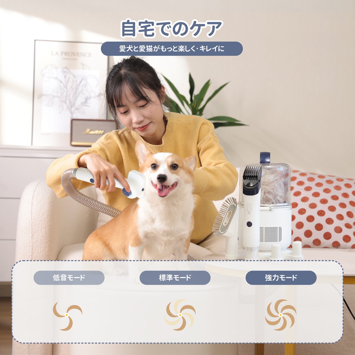 【3段階の吸引力モード&簡単操作】400Wの高速モーターを搭載、最大約12KPaの強い吸引力があり、トリミングしたりブラッシングしたりすると同時に抜け毛をしっかり吸い込め、作業時間の短縮とペットの負担の軽減ができます。