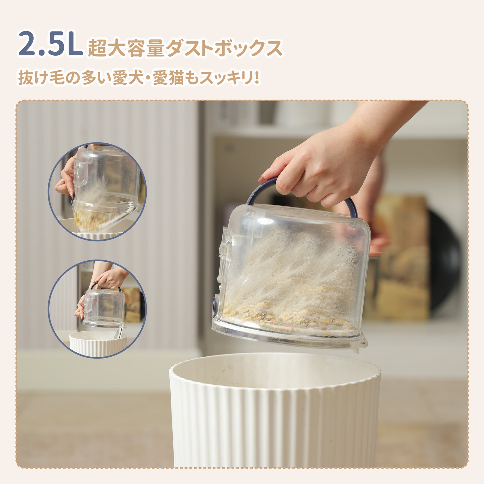 【2.5Lの超大容量ダストボックス&着脱簡単】ダストボックスは2.5L容量へと増やした設計になっており、大型犬への使用時に頻繁な毛の廃棄回数を削減できます。取った毛を自動にゴミ箱に吸引され、お掃除は不要です。抜け毛による頻繁なお掃除やトリミング後のお片付け、ブラッシング後の処理など、面倒な作業が不要になります。