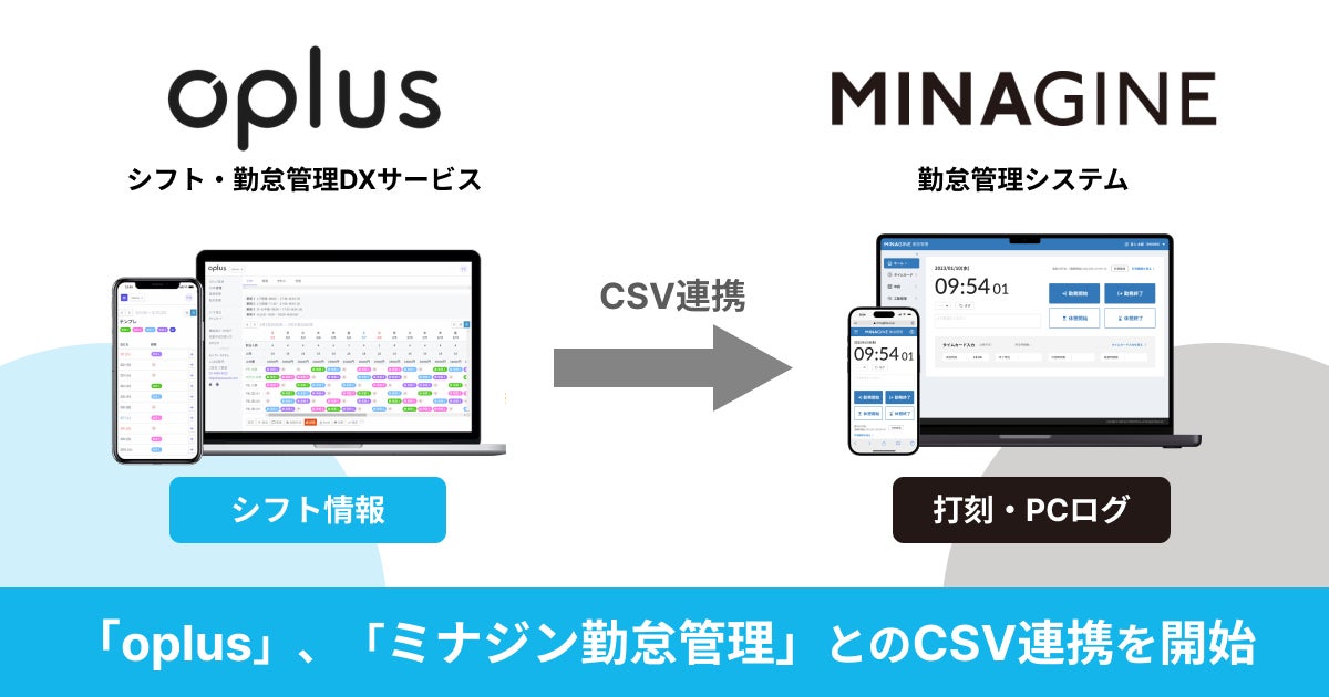 Oplus株式会社(本社:東京都渋谷区、代表取締役:杉原 和樹)が提供するブラウザ・スマホ・アプリの全てに対応したシフト・勤怠管理DXサービス「oplus(オプラス)」は、株式会社ミナジン(本社:大阪府大阪市、代表取締役社長:佐藤栄哲)が提供するクラウド型勤怠管理システム「ミナジン勤怠管理」との間で、CSV形式によるデータ連携を開始いたしました。