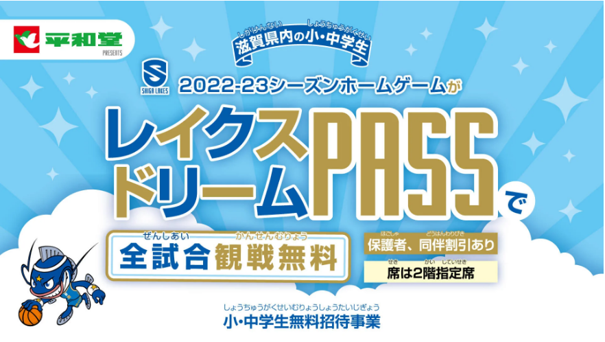 滋賀県内に在住・在学している全小・中学生を対象に「平和堂 presents レイクスドリームPASS」に登録し、観戦希望日のチケットをインターネット申込することで、2階指定席で無料観戦することができます。