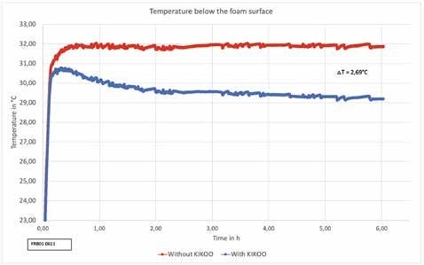 放熱シートを採用したZUKAN フトンと放熱シートを採用しない敷寝具で、表面温度の変化を見た。6時間経過後、ZUKAN フトンの表面温度は放熱シートを使用しない時と比べて2.6℃低かった。(ラジテック製造元調べ)