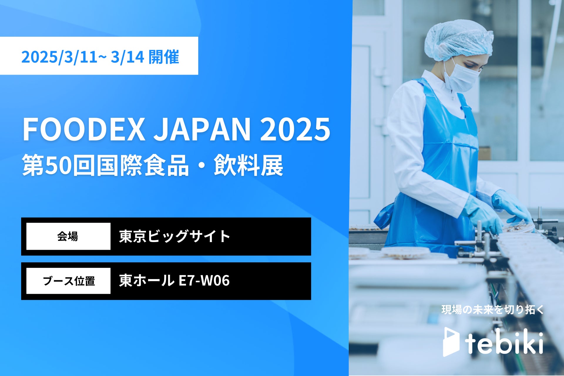 デスクレスワーカー向け現場支援システムを提供するTebiki株式会社(本社:東京都新宿区、代表取締役:貴山敬 / 以下、Tebiki)は、2025年3月11日(火)から3月14日(金)まで東京ビッグサイト(東京都江東区)にて開催される展示会「FOODEX JAPAN 2025」に出展します。
